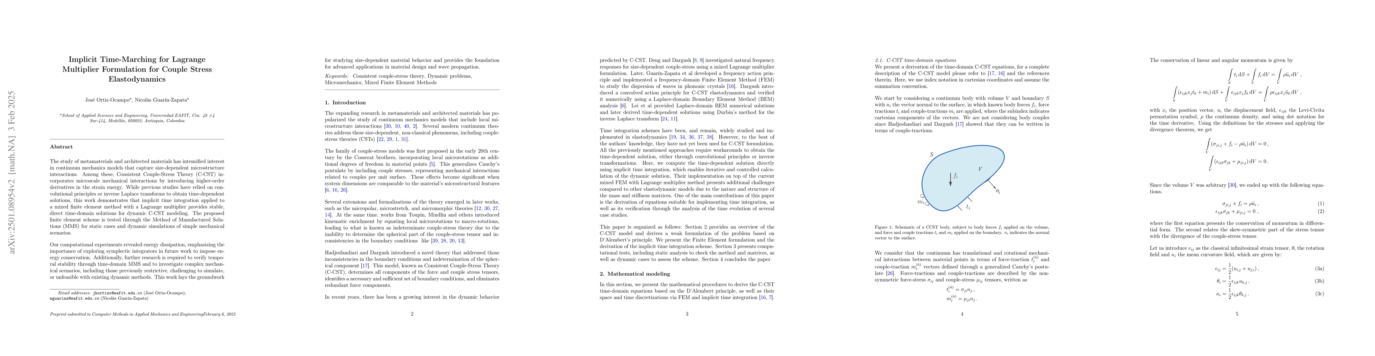 This paper proposes an implicit time-marching method for a mixed finite element analysis using Lagrange multipliers to solve the dynamics of Consistent Couple-Stress Theory in elastodynamics, ensuring stability and direct time-domain solutions. The method is validated against previous studies and opens new avenues for advanced material design and wave propagation research.
