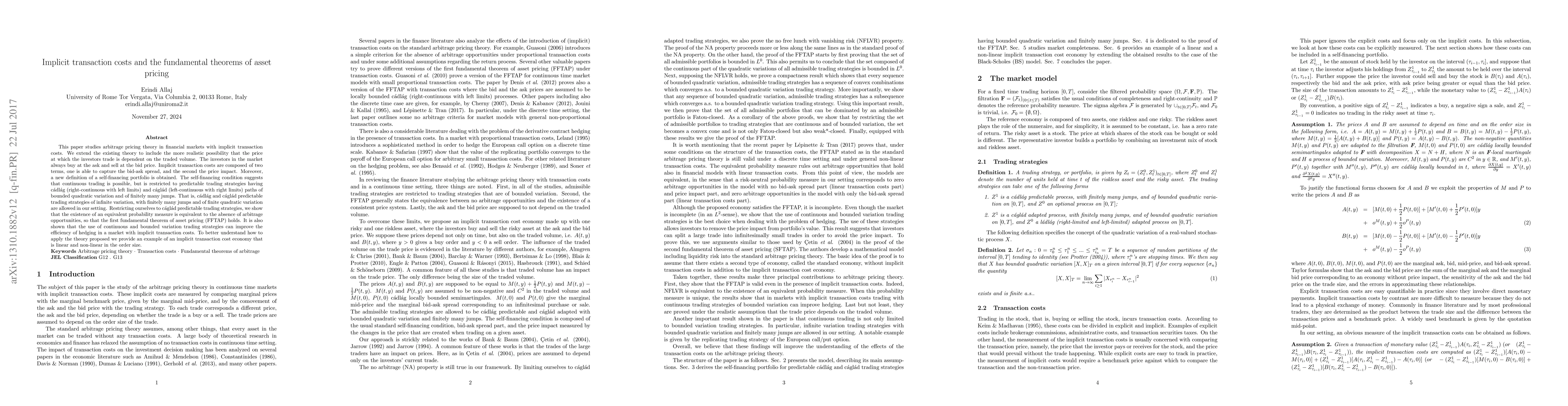 This paper studies arbitrage pricing theory in financial markets with implicit transaction costs. We extend the existing theory to include the more realistic possibility that the price at which the investors trade is dependent on the traded volume. The investors in the market always buy at the ask and sell at the bid price. Implicit transaction costs are composed of two terms, one is able to capture the bid-ask spread, and the second the price impact. Moreover, a new definition of a self-financing portfolio is obtained. The self-financing condition suggests that continuous trading is possible, but is restricted to predictable trading strategies having c\'adl\'ag (right-continuous with left limits) and c\'agl\'ad (left-continuous with right limits) paths of bounded quadratic variation and of finitely many jumps. That is, c\'adl\'ag and c\'agl\'ad predictable trading strategies of infinite variation, with finitely many jumps and of finite quadratic variation are allowed in our setting. Restricting ourselves to c\'agl\'ad predictable trading strategies, we show that the existence of an equivalent probability measure is equivalent to the absence of arbitrage opportunities, so that the first fundamental theorem of asset pricing (FFTAP) holds. It is also shown that the use of continuous and bounded variation trading strategies can improve the efficiency of hedging in a market with implicit transaction costs. To better understand how to apply the theory proposed we provide an example of an implicit transaction cost economy that is linear and non-linear in the order size.
