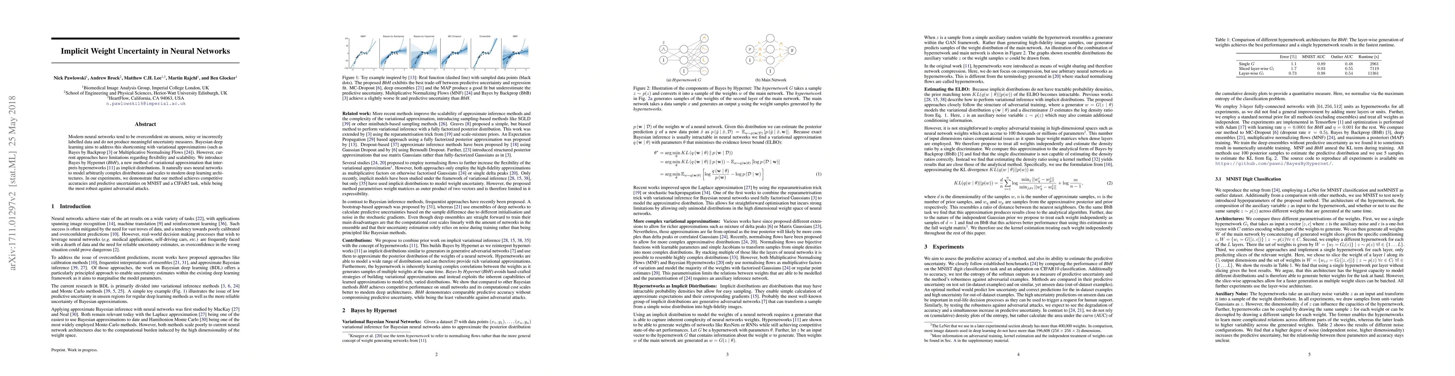 Modern neural networks tend to be overconfident on unseen, noisy or incorrectly labelled data and do not produce meaningful uncertainty measures. Bayesian deep learning aims to address this shortcoming with variational approximations (such as Bayes by Backprop or Multiplicative Normalising Flows). However, current approaches have limitations regarding flexibility and scalability. We introduce Bayes by Hypernet (BbH), a new method of variational approximation that interprets hypernetworks as implicit distributions. It naturally uses neural networks to model arbitrarily complex distributions and scales to modern deep learning architectures. In our experiments, we demonstrate that our method achieves competitive accuracies and predictive uncertainties on MNIST and a CIFAR5 task, while being the most robust against adversarial attacks.