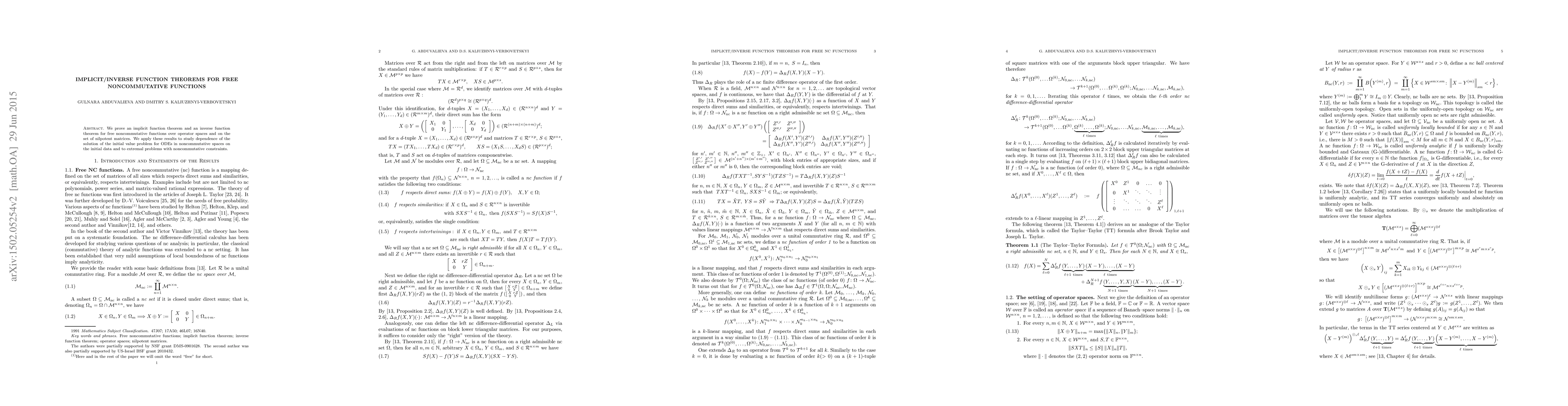 This paper proves implicit and inverse function theorems for free noncommutative functions in operator spaces and nilpotent matrices, and applies these results to study dependencies in noncommutative initial value problems for ODEs and extremal problems with noncommutative constraints.