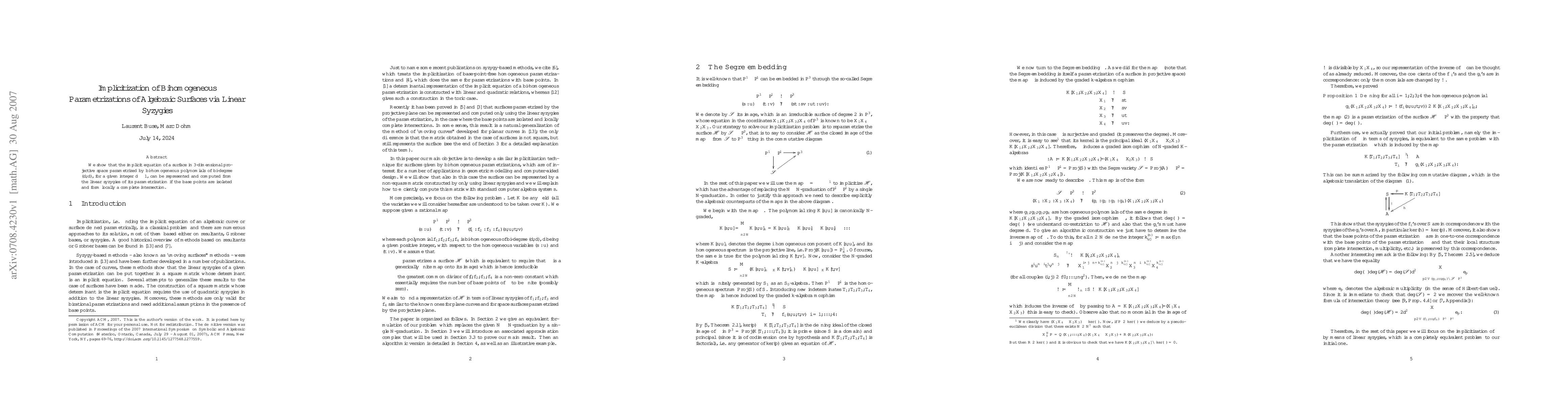 Researchers found that bi-homogeneous surface parametrizations can be represented by linear syzygies, enabling the computation of implicit equations for surfaces in 3D projective space.