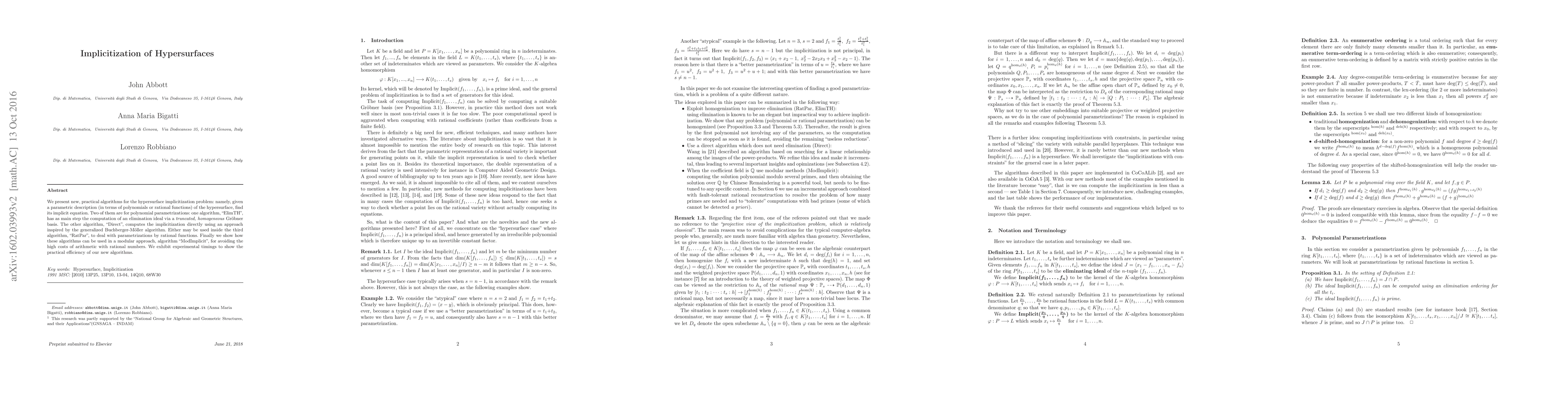 The paper presents new algorithms for implicitizing hypersurfaces given by polynomial or rational parametric descriptions, utilizing techniques such as truncated homogeneous Gröbner bases and generalized Buchberger-Möller algorithms.