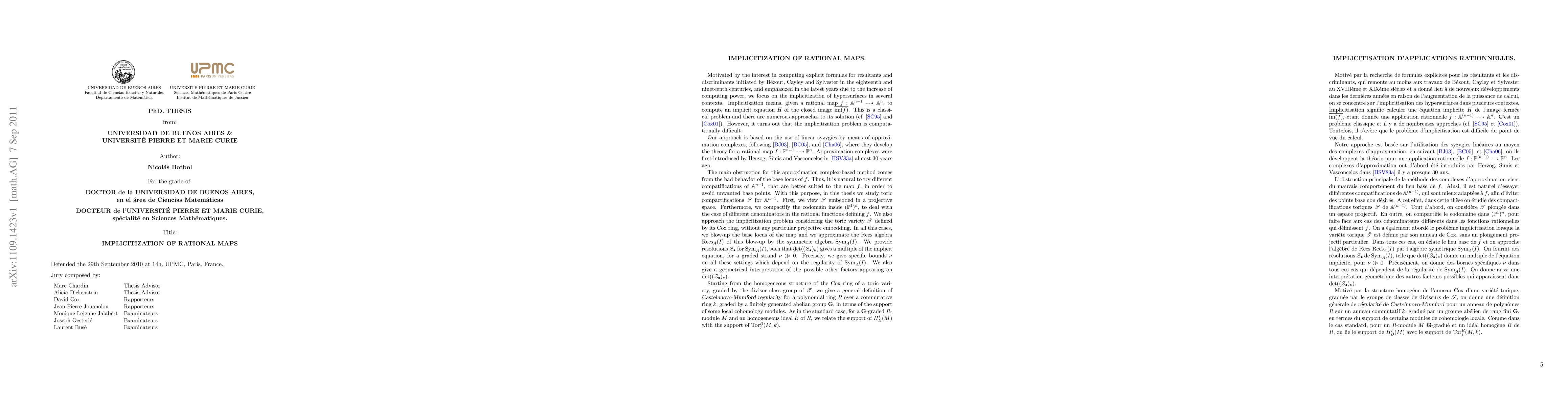 Motivated by the interest in computing explicit formulas for resultants and discriminants initiated by B\'ezout, Cayley and Sylvester in the eighteenth and nineteenth centuries, and emphasized in the latest years due to the increase of computing power, we focus on the implicitization of hypersurfaces in several contexts. Our approach is based on the use of linear syzygies by means of approximation complexes, following [Bus\'e Jouanolou 03], where they develop the theory for a rational map $f:P^{n-1}\dashrightarrow P^n$. Approximation complexes were first introduced by Herzog, Simis and Vasconcelos in [Herzog Simis Vasconcelos 82] almost 30 years ago. The main obstruction for this approximation complex-based method comes from the bad behavior of the base locus of $f$. Thus, it is natural to try different compatifications of $A^{n-1}$, that are better suited to the map $f$, in order to avoid unwanted base points. With this purpose, in this thesis we study toric compactifications $T$ for $A^{n-1}$. We provide resolutions $Z.$ for $Sym_I(A)$, such that $\det((Z.)_\nu)$ gives a multiple of the implicit equation, for a graded strand $\nu\gg 0$. Precisely, we give specific bounds $\nu$ on all these settings which depend on the regularity of $\SIA$. Starting from the homogeneous structure of the Cox ring of a toric variety, graded by the divisor class group of $T$, we give a general definition of Castelnuovo-Mumford regularity for a polynomial ring $R$ over a commutative ring $k$, graded by a finitely generated abelian group $G$, in terms of the support of some local cohomology modules. As in the standard case, for a $G$-graded $R$-module $M$ and an homogeneous ideal $B$ of $R$, we relate the support of $H_B^i(M)$ with the support of $Tor_j^R(M,k)$.
