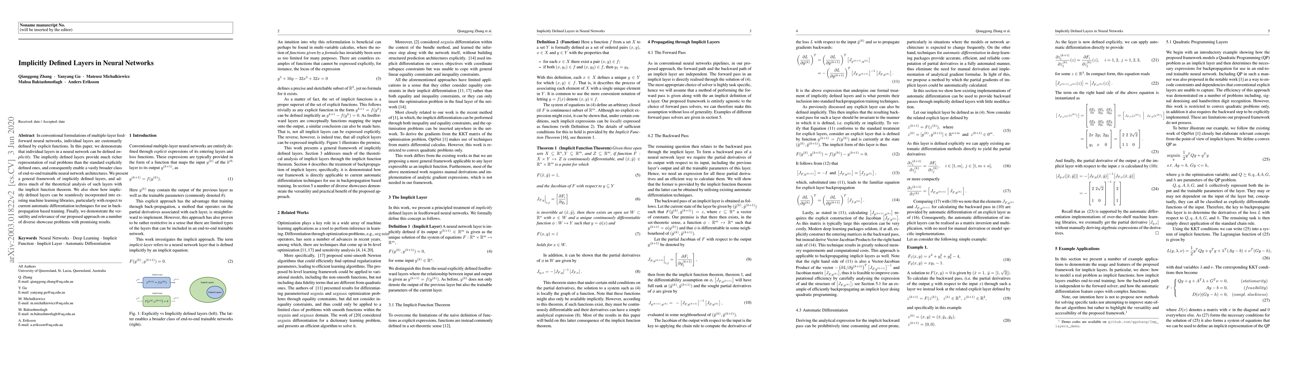 In conventional formulations of multilayer feedforward neural networks, the individual layers are customarily defined by explicit functions. In this paper we demonstrate that defining individual layers in a neural network \emph{implicitly} provide much richer representations over the standard explicit one, consequently enabling a vastly broader class of end-to-end trainable architectures. We present a general framework of implicitly defined layers, where much of the theoretical analysis of such layers can be addressed through the implicit function theorem. We also show how implicitly defined layers can be seamlessly incorporated into existing machine learning libraries. In particular with respect to current automatic differentiation techniques for use in backpropagation based training. Finally, we demonstrate the versatility and relevance of our proposed approach on a number of diverse example problems with promising results.