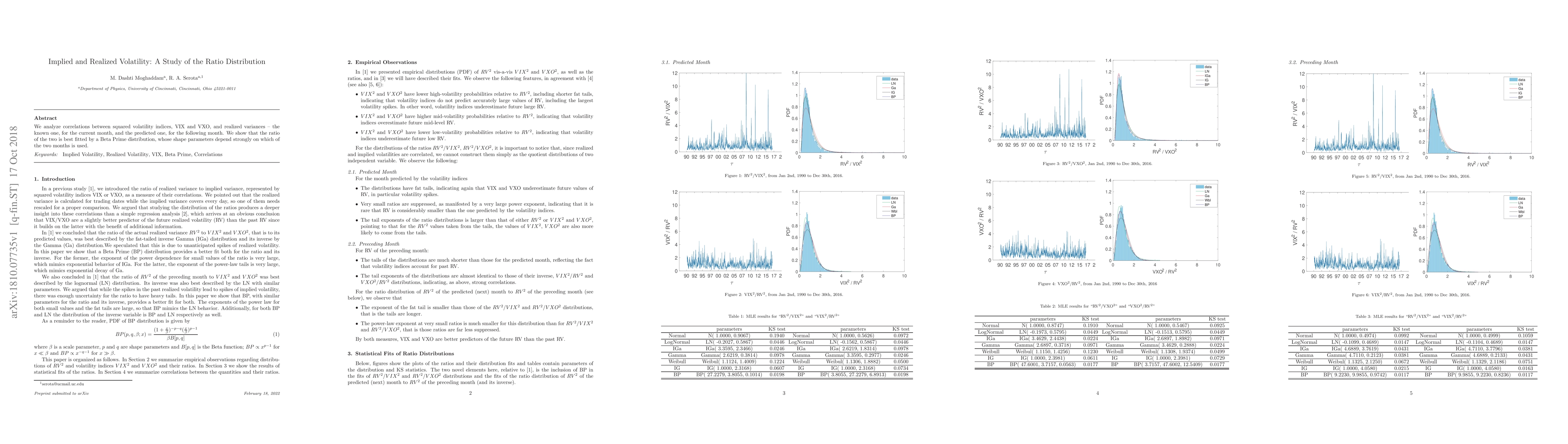This study investigates the correlation between VIX and VXO indices and realized variances, demonstrating that the ratio distribution of implied volatility to realized variance is best modeled by a Beta Prime distribution, with shape parameters varying based on the month considered.