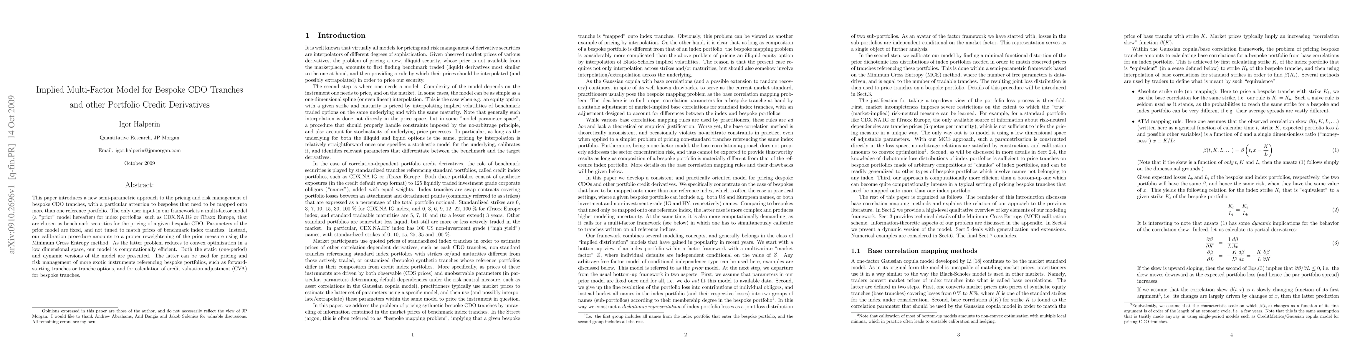 The paper introduces a semi-parametric approach for pricing and risk management of bespoke CDO tranches using a multi-factor model, calibrated via the Minimum Cross Entropy (MCE) method, ensuring computational efficiency and no-arbitrage in bespoke pricing.
