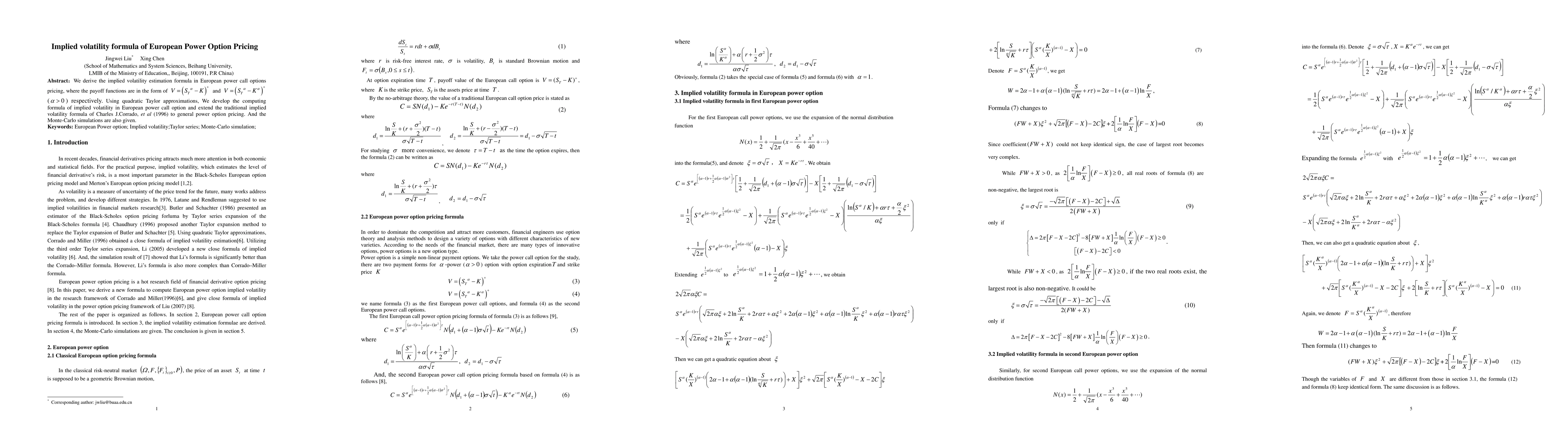 This paper derives an implied volatility estimation formula for European power call options using quadratic Taylor approximations, extending Corrado's traditional implied volatility formula to general power options. Monte-Carlo simulations are provided to validate the developed formula.