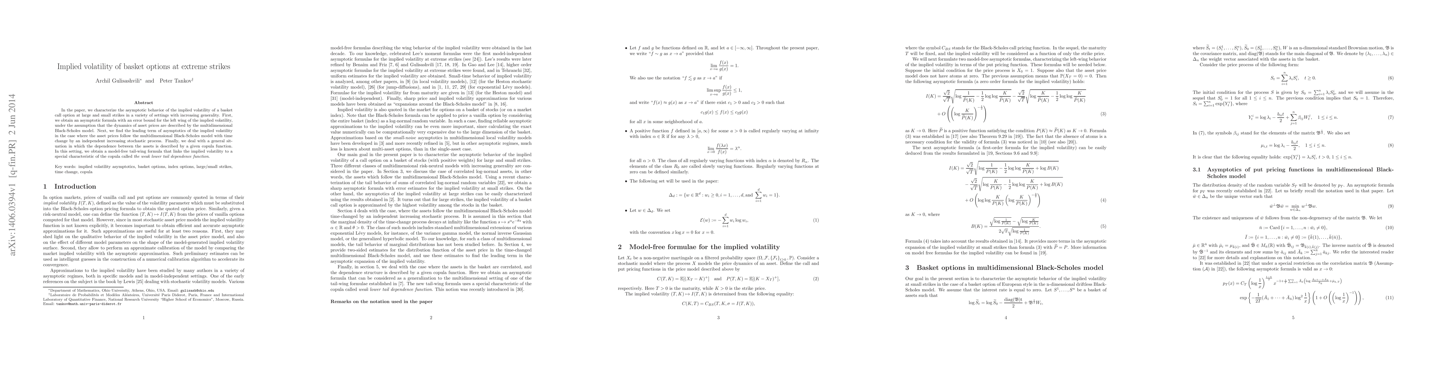 In the paper, we characterize the asymptotic behavior of the implied volatility of a basket call option at large and small strikes in a variety of settings with increasing generality. First, we obtain an asymptotic formula with an error bound for the left wing of the implied volatility, under the assumption that the dynamics of asset prices are described by the multidimensional Black-Scholes model. Next, we find the leading term of asymptotics of the implied volatility in the case where the asset prices follow the multidimensional Black-Scholes model with time change by an independent increasing stochastic process. Finally, we deal with a general situation in which the dependence between the assets is described by a given copula function. In this setting, we obtain a model-free tail-wing formula that links the implied volatility to a special characteristic of the copula called the weak lower tail dependence function.