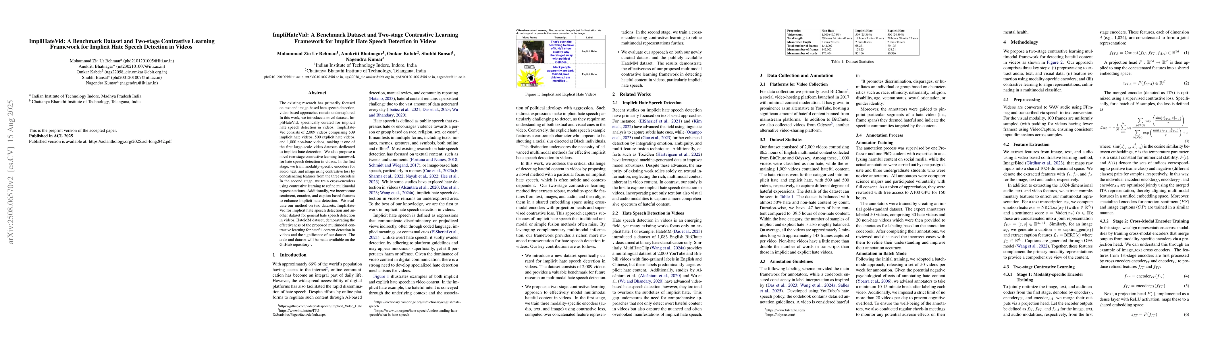 The existing research has primarily focused on text and image-based hate speech detection, video-based approaches remain underexplored. In this work, we introduce a novel dataset, ImpliHateVid, specifically curated for implicit hate speech detection in videos. ImpliHateVid consists of 2,009 videos comprising 509 implicit hate videos, 500 explicit hate videos, and 1,000 non-hate videos, making it one of the first large-scale video datasets dedicated to implicit hate detection. We also propose a novel two-stage contrastive learning framework for hate speech detection in videos. In the first stage, we train modality-specific encoders for audio, text, and image using contrastive loss by concatenating features from the three encoders. In the second stage, we train cross-encoders using contrastive learning to refine multimodal representations. Additionally, we incorporate sentiment, emotion, and caption-based features to enhance implicit hate detection. We evaluate our method on two datasets, ImpliHateVid for implicit hate speech detection and another dataset for general hate speech detection in videos, HateMM dataset, demonstrating the effectiveness of the proposed multimodal contrastive learning for hateful content detection in videos and the significance of our dataset.