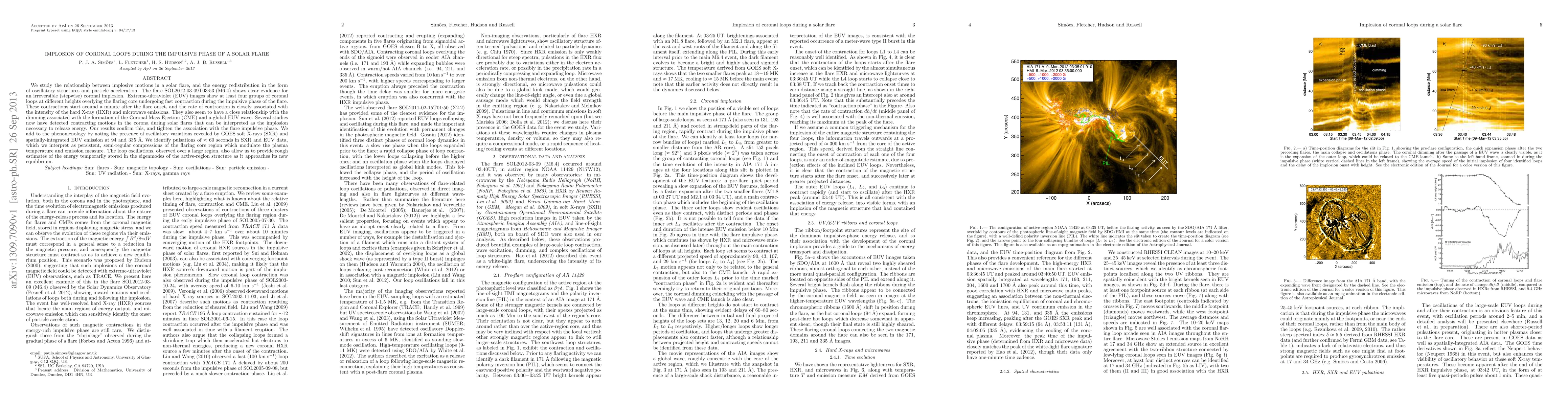 This paper investigates the implosion of coronal loops during the impulsive phase of a solar flare, finding a strong correlation between loop contractions and hard X-ray and microwave emissions. The study identifies oscillatory variations in soft X-ray and EUV emissions, suggesting persistent compressions that modulate the plasma temperature and emission measure, and provides estimates of the energy stored in the active region's eigenmodes.