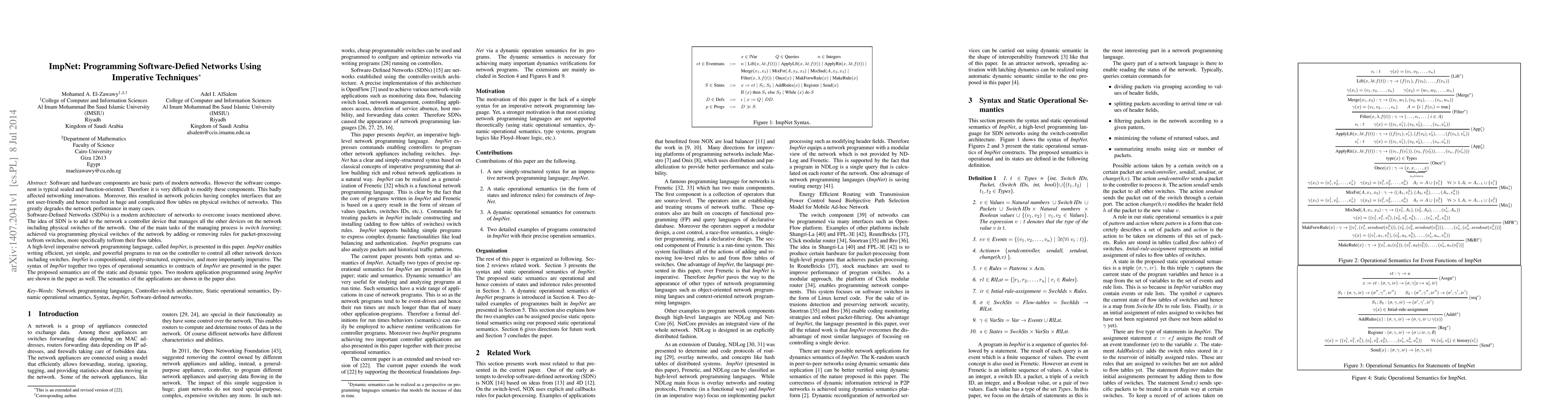 Software and hardware components are basic parts of modern networks. However the software compo- nent is typical sealed and function-oriented. Therefore it is very difficult to modify these components. This badly affected networking innovations. Moreover, this resulted in network policies having complex interfaces that are not user-friendly and hence resulted in huge and complicated flow tables on physical switches of networks. This greatly degrades the network performance in many cases. Software-Defined Networks (SDNs) is a modern architecture of networks to overcome issues mentioned above. The idea of SDN is to add to the network a controller device that manages all the other devices on the network including physical switches of the network. One of the main tasks of the managing process is switch learning; achieved via programming physical switches of the network by adding or removing rules for packet-processing to/from switches, more specifically to/from their flow tables. A high-level imperative network programming language, called ImpNet, is presented in this paper. ImpNet enables writing efficient, yet simple, and powerful programs to run on the controller to control all other network devices including switches. ImpNet is compositional, simply-structured, expressive, and more importantly imperative. The syntax of ImpNet together two types of operational semantics to contracts of ImpNet are presented in the paper. The proposed semantics are of the static and dynamic types. Two modern application programmed using ImpNet are shown in the paper as well. The semantics of the applications are shown in the paper also.
