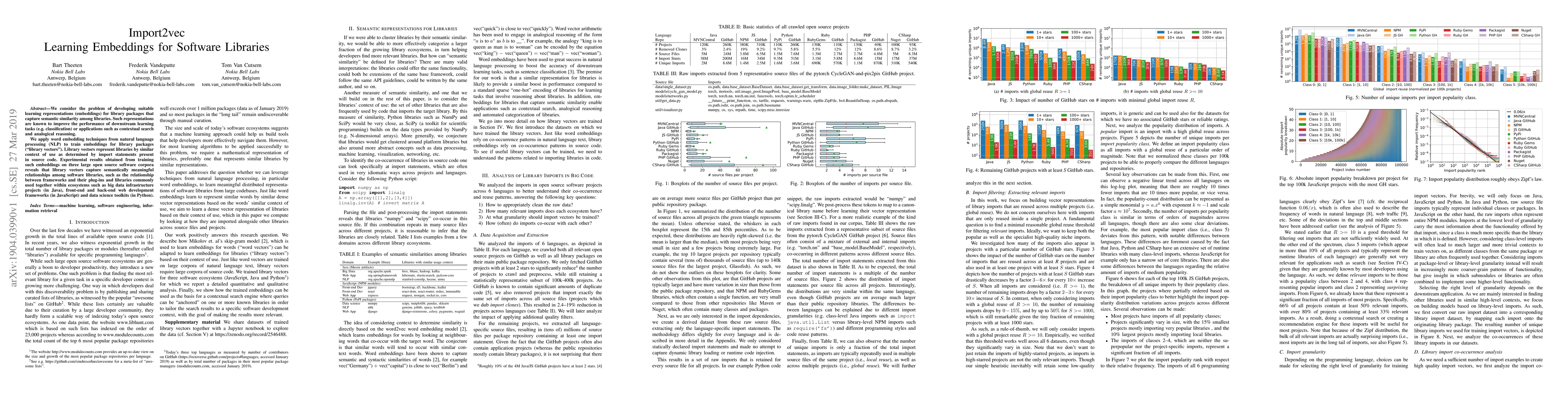 Import2vec trains embeddings for software libraries based on import statements to capture semantic similarity, improving downstream tasks like classification and search. Experimental results show that these "library vectors" effectively represent meaningful relationships among libraries in various ecosystems.