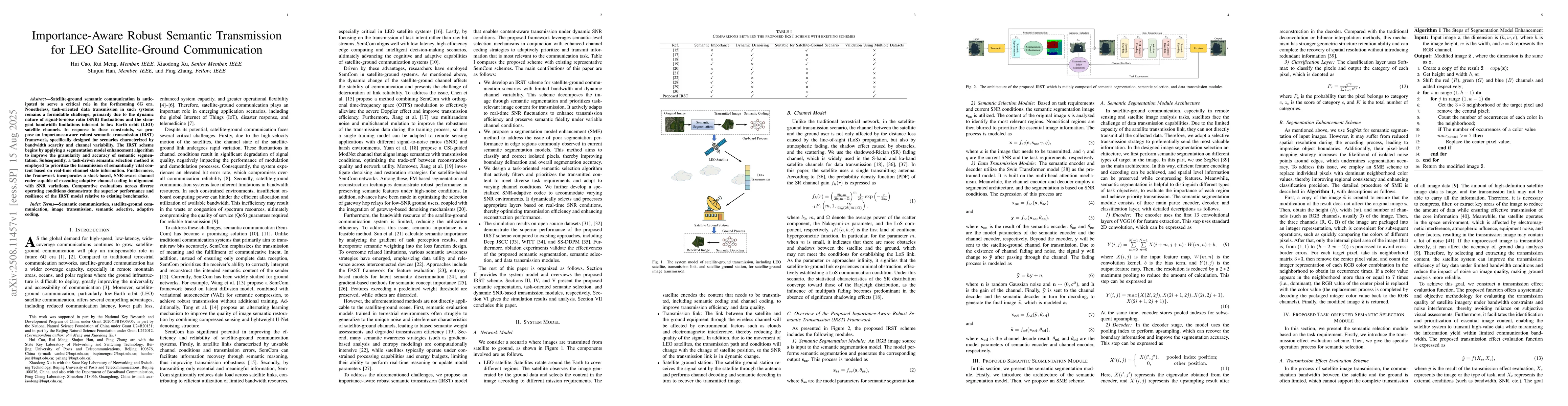 Satellite-ground semantic communication is anticipated to serve a critical role in the forthcoming 6G era. Nonetheless, task-oriented data transmission in such systems remains a formidable challenge, primarily due to the dynamic nature of signal-to-noise ratio (SNR) fluctuations and the stringent bandwidth limitations inherent to low Earth orbit (LEO) satellite channels. In response to these constraints, we propose an importance-aware robust semantic transmission (IRST) framework, specifically designed for scenarios characterized by bandwidth scarcity and channel variability. The IRST scheme begins by applying a segmentation model enhancement algorithm to improve the granularity and accuracy of semantic segmentation. Subsequently, a task-driven semantic selection method is employed to prioritize the transmission of semantically vital content based on real-time channel state information. Furthermore, the framework incorporates a stack-based, SNR-aware channel codec capable of executing adaptive channel coding in alignment with SNR variations. Comparative evaluations across diverse operating conditions demonstrate the superior performance and resilience of the IRST model relative to existing benchmarks.