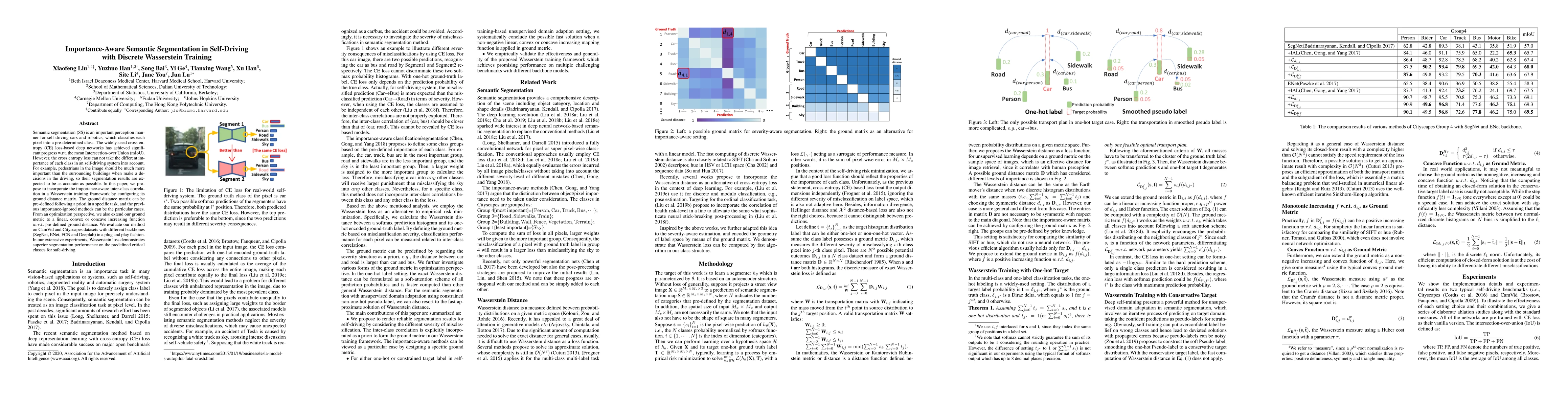 This paper proposes an importance-aware semantic segmentation method for self-driving cars using a discrete Wasserstein training framework that incorporates inter-class correlations based on predefined importance levels. The method outperforms traditional cross entropy loss by focusing on critical classes like pedestrians, as demonstrated through experiments on CamVid and Cityscapes datasets.
