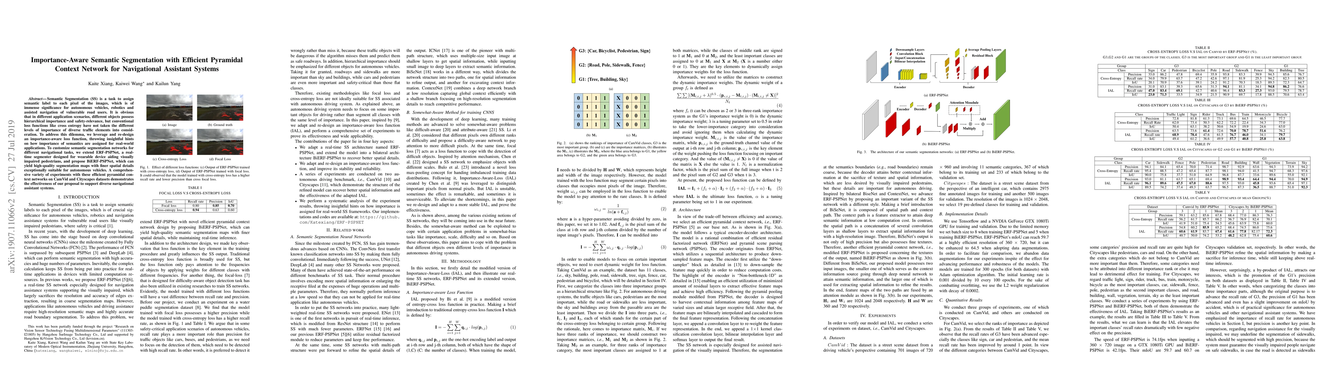 This paper proposes an importance-aware loss function and an extended ERF-PSPNet model, BiERF-PSPNet, for semantic segmentation to better handle hierarchical importance in navigation tasks. Experiments on CamVid and Cityscapes datasets show its effectiveness in diverse navigational assistant systems.