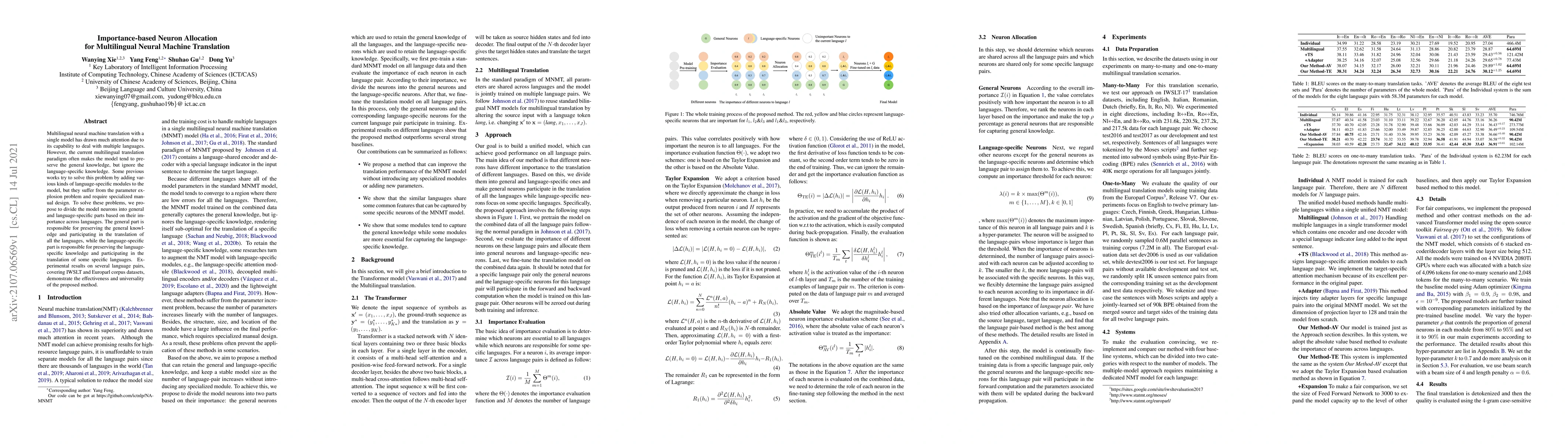 This paper proposes a method to allocate neurons in multilingual neural machine translation models based on their importance to different languages, dividing them into general and language-specific parts to balance general and specific knowledge. Experimental results show the method's effectiveness in improving translation quality across multiple languages.