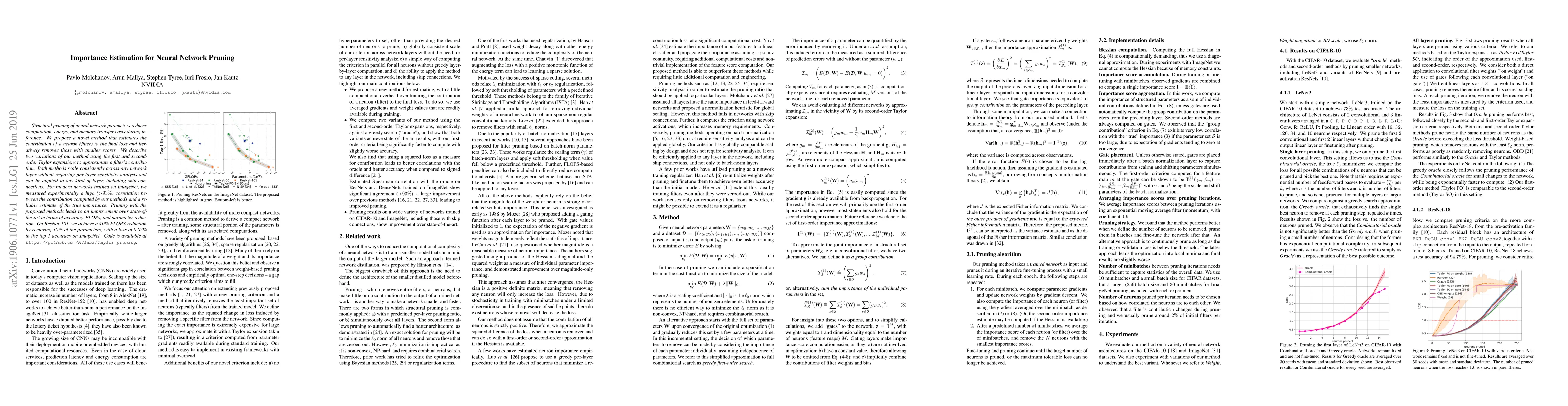 Structural pruning of neural network parameters reduces computation, energy, and memory transfer costs during inference. We propose a novel method that estimates the contribution of a neuron (filter) to the final loss and iteratively removes those with smaller scores. We describe two variations of our method using the first and second-order Taylor expansions to approximate a filter's contribution. Both methods scale consistently across any network layer without requiring per-layer sensitivity analysis and can be applied to any kind of layer, including skip connections. For modern networks trained on ImageNet, we measured experimentally a high (>93%) correlation between the contribution computed by our methods and a reliable estimate of the true importance. Pruning with the proposed methods leads to an improvement over state-of-the-art in terms of accuracy, FLOPs, and parameter reduction. On ResNet-101, we achieve a 40% FLOPS reduction by removing 30% of the parameters, with a loss of 0.02% in the top-1 accuracy on ImageNet. Code is available at https://github.com/NVlabs/Taylor_pruning.