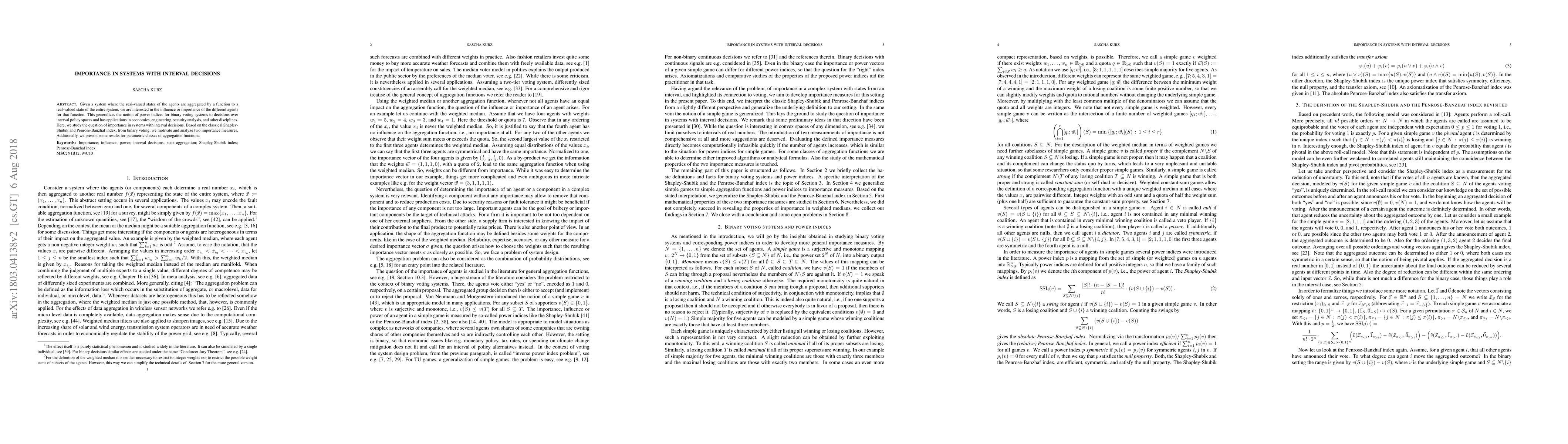 Given a system where the real-valued states of the agents are aggregated by a function to a real-valued state of the entire system, we are interested in the influence or importance of the different agents for that function. This generalizes the notion of power indices for binary voting systems to decisions over interval policy spaces and has applications in economics, engineering, security analysis, and other disciplines. Here, we study the question of importance in systems with interval decisions. Based on the classical Shapley-Shubik and Penrose-Banzhaf index, from binary voting, we motivate and analyze two importance measures. Additionally, we present some results for parametric classes of aggregation functions.