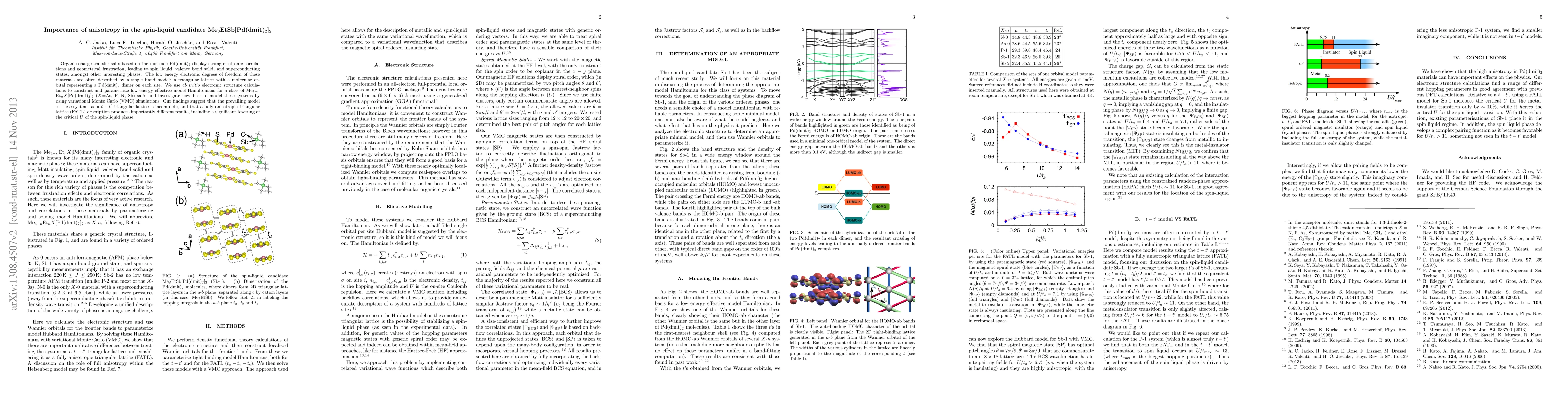 Organic charge transfer salts based on the molecule Pd(dmit)2 display strong electronic correlations and geometrical frustration, leading to spin liquid, valence bond solid, and superconducting states, amongst other interesting phases. The low energy electronic degrees of freedom of these materials are often described by a single band model; a triangular lattice with a molecular orbital representing a Pd(dmit)2 dimer on each site. We use ab initio electronic structure calculations to construct and parametrize low energy effective model Hamiltonians for a class of Me(4-n) EtnX[Pd(dmit)2]2 (X=As,P,N,Sb) salts and investigate how best to model these systems by using variational Monte Carlo (VMC) simulations. Our findings suggest that the prevailing model of these systems as a t-t' triangular lattice is incomplete, and that a fully anisotropic triangular lattice (FATL) description produces importantly different results, including a significant lowering of the critical U of the spin-liquid phase.