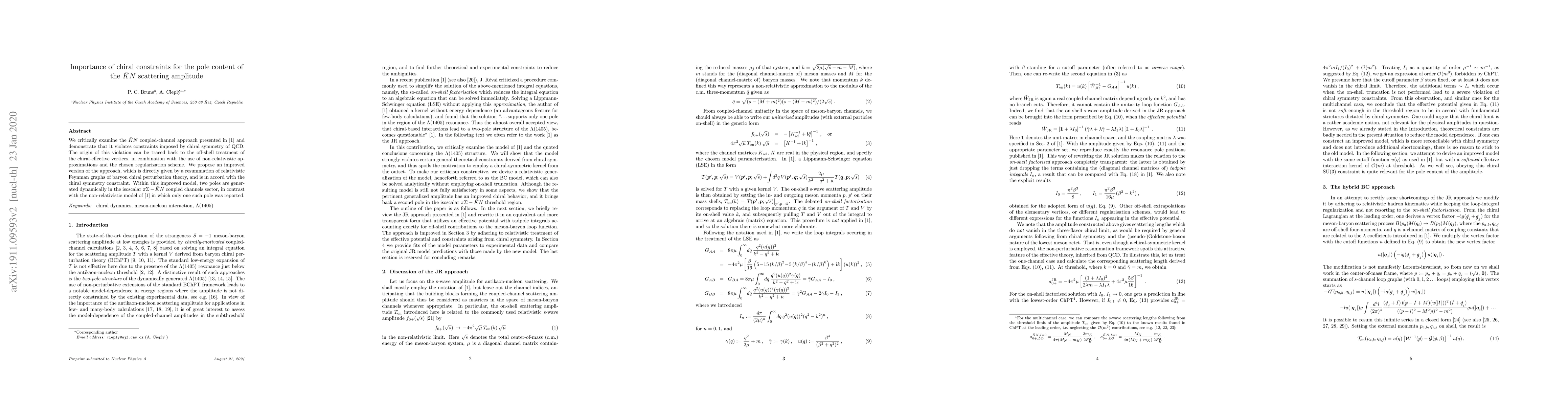 We critically examine the $\bar{K}N$ coupled-channel approach presented in [1] and demonstrate that it violates constraints imposed by chiral symmetry of QCD. The origin of this violation can be traced back to the off-shell treatment of the chiral-effective vertices, in combination with the use of non-relativistic approximations and the chosen regularization scheme. We propose an improved version of the approach, which is directly given by a resummation of relativistic Feynman graphs of baryon chiral perturbation theory, and is in accord with the chiral symmetry constraint. Within this improved model, two poles are generated dynamically in the isoscalar $\pi\Sigma - \bar{K}N$ coupled channels sector, in contrast with the non-relativistic model of [1] in which only one such pole was reported.