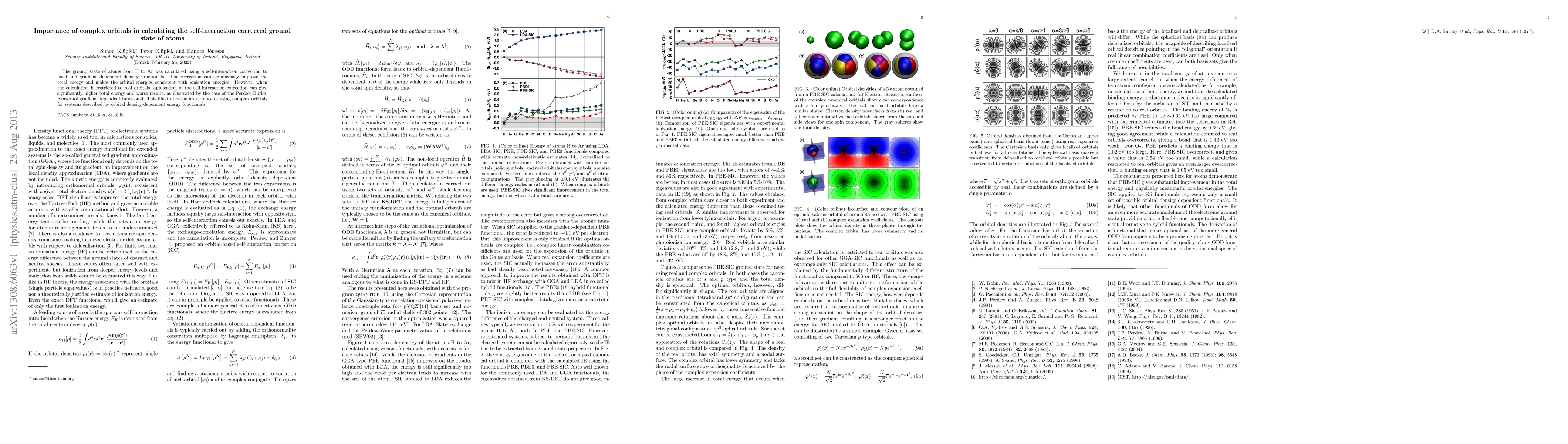 The ground state of atoms from H to Ar was calculated using a self-interaction correction to local and gradient dependent density functionals. The correction can significantly improve the total energy and makes the orbital energies consistent with ionization energies. However, when the calculation is restricted to real orbitals, application of the self-interaction correction can give significantly higher total energy and worse results, as illustrated by the case of the Perdew-Burke-Ernzerhof gradient dependent functional. This illustrates the importance of using complex orbitals for systems described by orbital density dependent energy functionals.