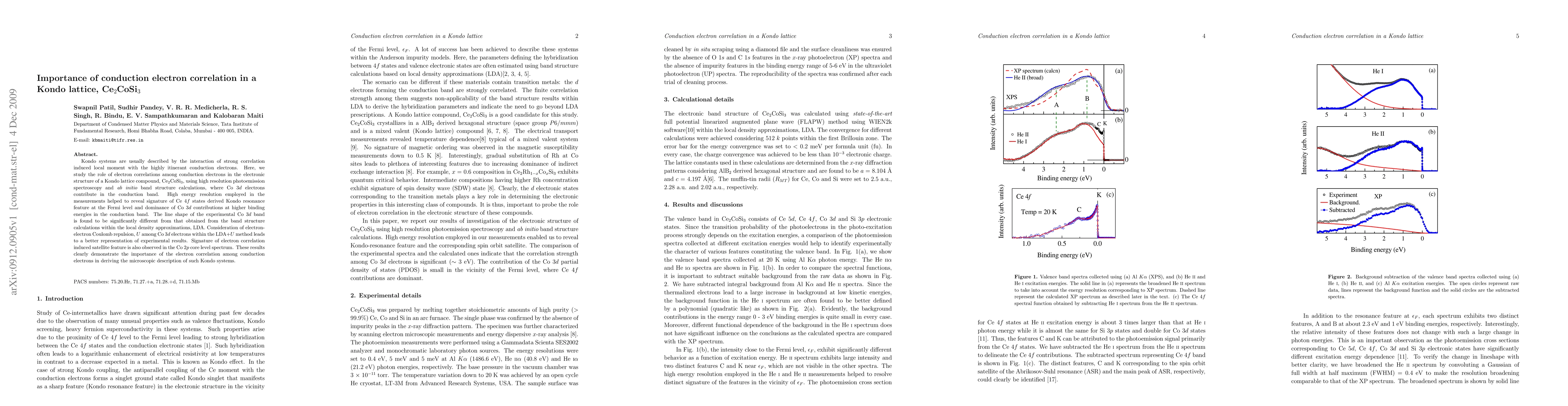 Kondo systems are usually described by the interaction of strong correlation induced local moment with the highly itinerant conduction electrons. Here, we study the role of electron correlations among conduction electrons in the electronic structure of a Kondo lattice compound, Ce$_2$CoSi$_3$, using high resolution photoemission spectroscopy and {\it ab initio} band structure calculations, where Co 3$d$ electrons contribute in the conduction band. High energy resolution employed in the measurements helped to reveal signature of Ce 4$f$ states derived Kondo resonance feature at the Fermi level and dominance of Co 3$d$ contributions at higher binding energies in the conduction band. The line shape of the experimental Co 3$d$ band is found to be significantly different from that obtained from the band structure calculations within the local density approximations, LDA. Consideration of electron-electron Coulomb repulsion, $U$ among Co 3$d$ electrons within the LDA+$U$ method leads to a better representation of experimental results. Signature of electron correlation induced satellite feature is also observed in the Co 2$p$ core level spectrum. These results clearly demonstrate the importance of the electron correlation among conduction electrons in deriving the microscopic description of such Kondo systems.