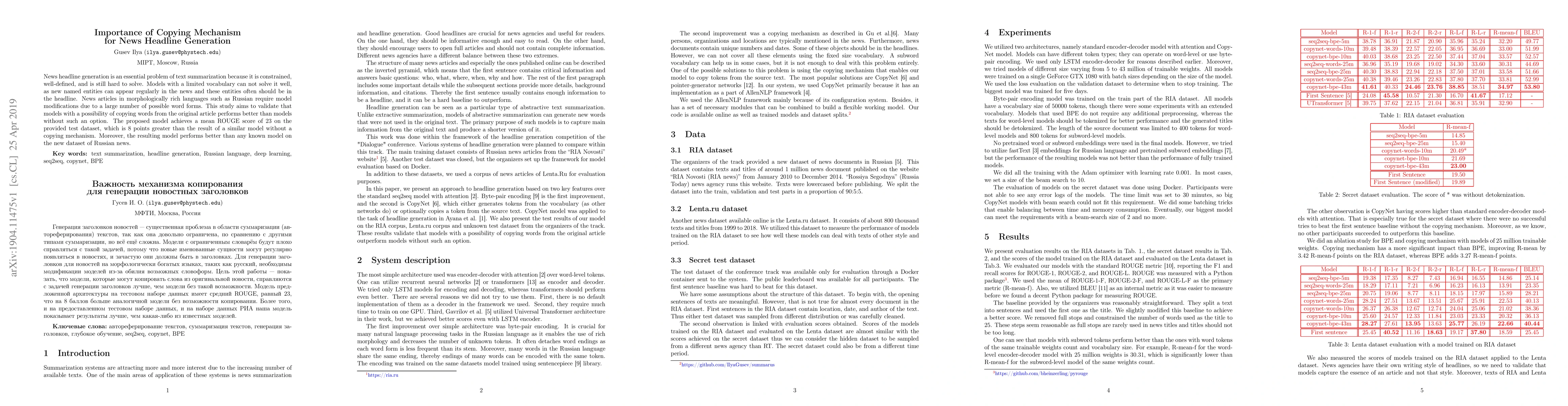 News headline generation is an essential problem of text summarization because it is constrained, well-defined, and is still hard to solve. Models with a limited vocabulary can not solve it well, as new named entities can appear regularly in the news and these entities often should be in the headline. News articles in morphologically rich languages such as Russian require model modifications due to a large number of possible word forms. This study aims to validate that models with a possibility of copying words from the original article performs better than models without such an option. The proposed model achieves a mean ROUGE score of 23 on the provided test dataset, which is 8 points greater than the result of a similar model without a copying mechanism. Moreover, the resulting model performs better than any known model on the new dataset of Russian news.