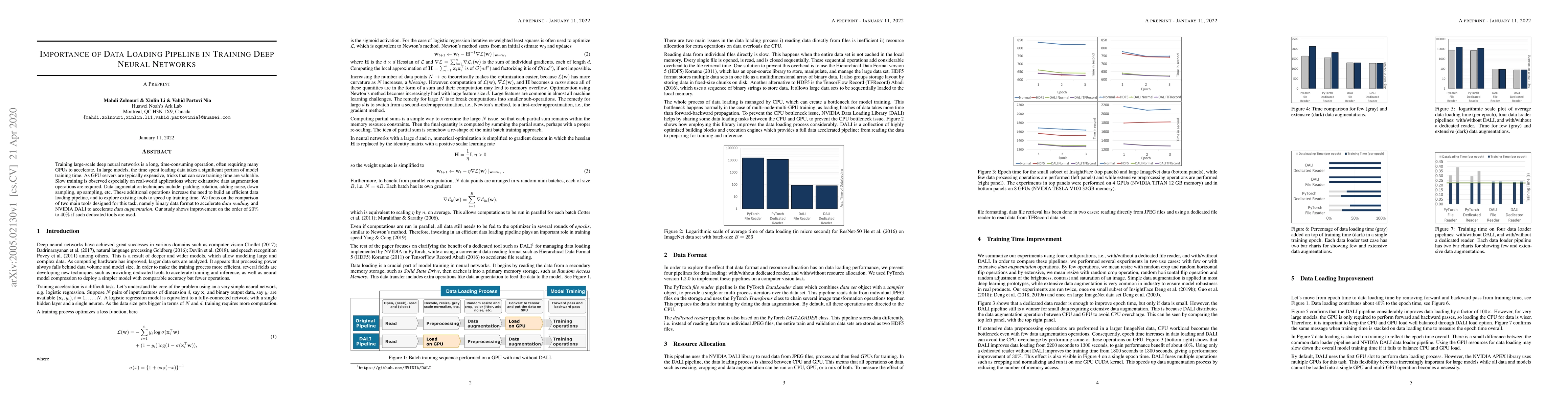 This paper explores the importance of an efficient data loading pipeline in training large-scale deep neural networks, emphasizing the significant time spent on data loading and augmentation. It compares binary data formats and NVIDIA DALI for data augmentation, finding that using these tools can improve training speed by 20% to 40%.
