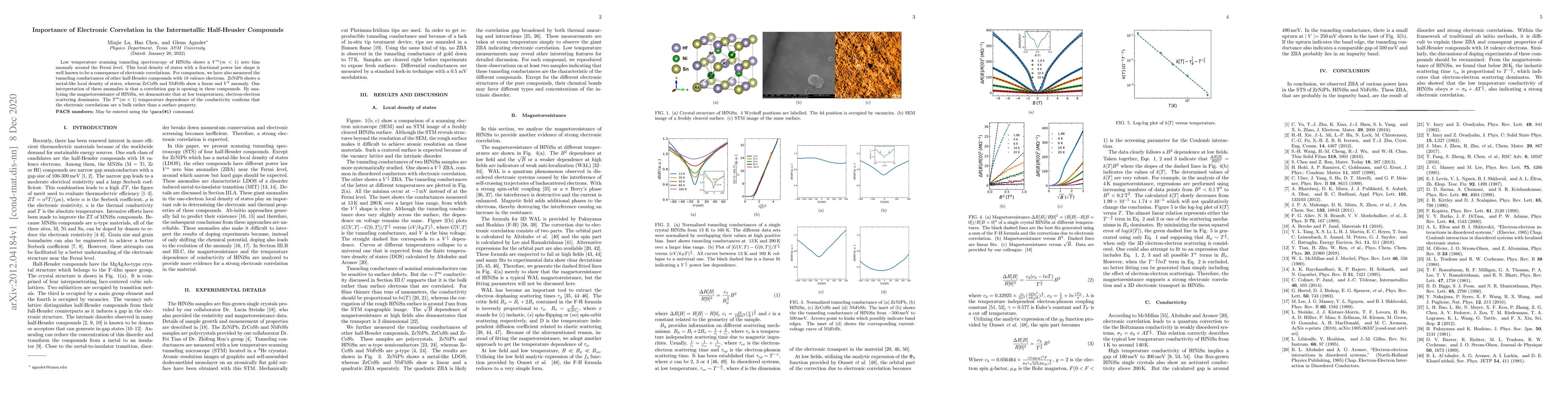 Low temperature scanning tunneling spectroscopy of HfNiSn shows a V^m(m < 1) zero bias anomaly around the Fermi level. This local density of states with a fractional power law shape is well known to be a consequence of electronic correlations. For comparison, we have also measured the tunneling conductances of other half-Heusler compounds with 18 valence electrons. ZrNiPb shows a metal-like local density of states, whereas ZrCoSb and NbFeSb show a linear and V^2 anomaly. One interpretation of these anomalies is that a correlation gap is opening in these compounds. By analyzing the magnetoresistance of HfNiSn, we demonstrate that at low temperatures, electron-electron scattering dominates. The T^m(m < 1) temperature dependence of the conductivity confirms that the electronic correlations are a bulk rather than a surface property.