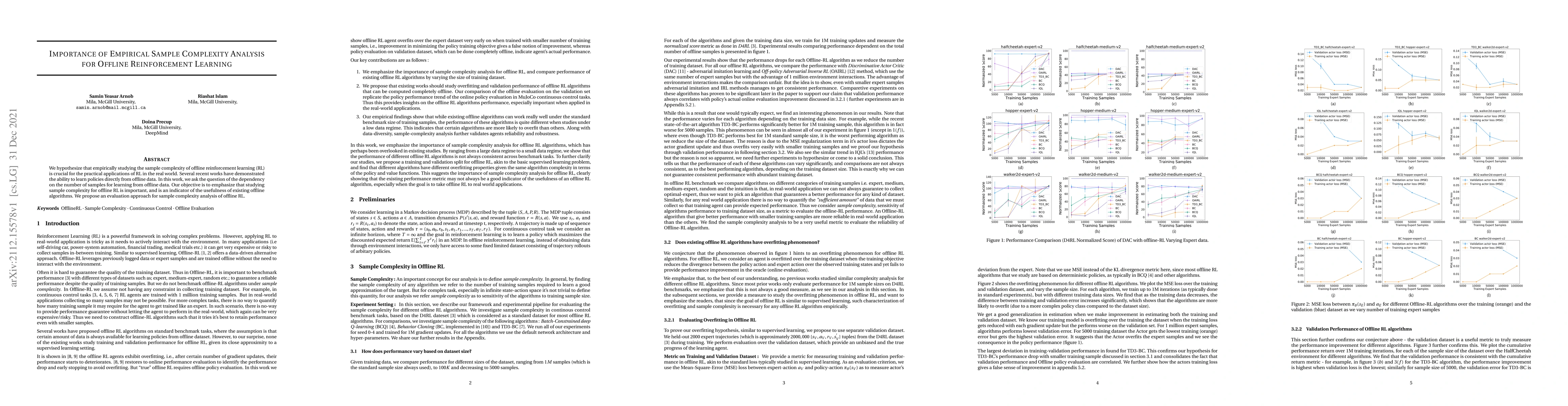 We hypothesize that empirically studying the sample complexity of offline reinforcement learning (RL) is crucial for the practical applications of RL in the real world. Several recent works have demonstrated the ability to learn policies directly from offline data. In this work, we ask the question of the dependency on the number of samples for learning from offline data. Our objective is to emphasize that studying sample complexity for offline RL is important, and is an indicator of the usefulness of existing offline algorithms. We propose an evaluation approach for sample complexity analysis of offline RL.