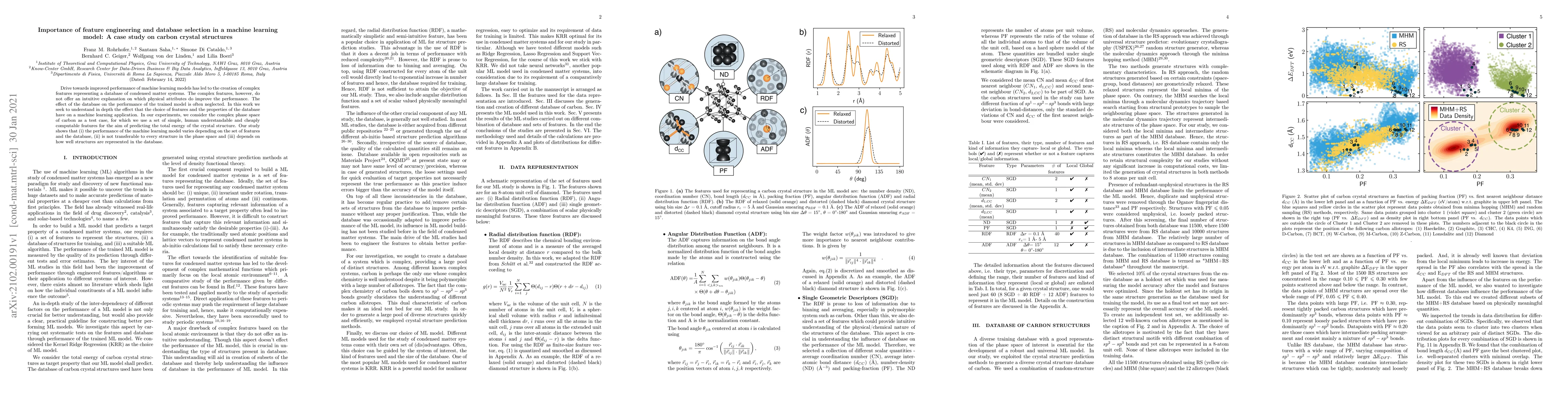 Drive towards improved performance of machine learning models has led to the creation of complex features representing a database of condensed matter systems. The complex features, however, do not offer an intuitive explanation on which physical attributes do improve the performance. The effect of the database on the performance of the trained model is often neglected. In this work we seek to understand in depth the effect that the choice of features and the properties of the database have on a machine learning application. In our experiments, we consider the complex phase space of carbon as a test case, for which we use a set of simple, human understandable and cheaply computable features for the aim of predicting the total energy of the crystal structure. Our study shows that (i) the performance of the machine learning model varies depending on the set of features and the database, (ii) is not transferable to every structure in the phase space and (iii) depends on how well structures are represented in the database.