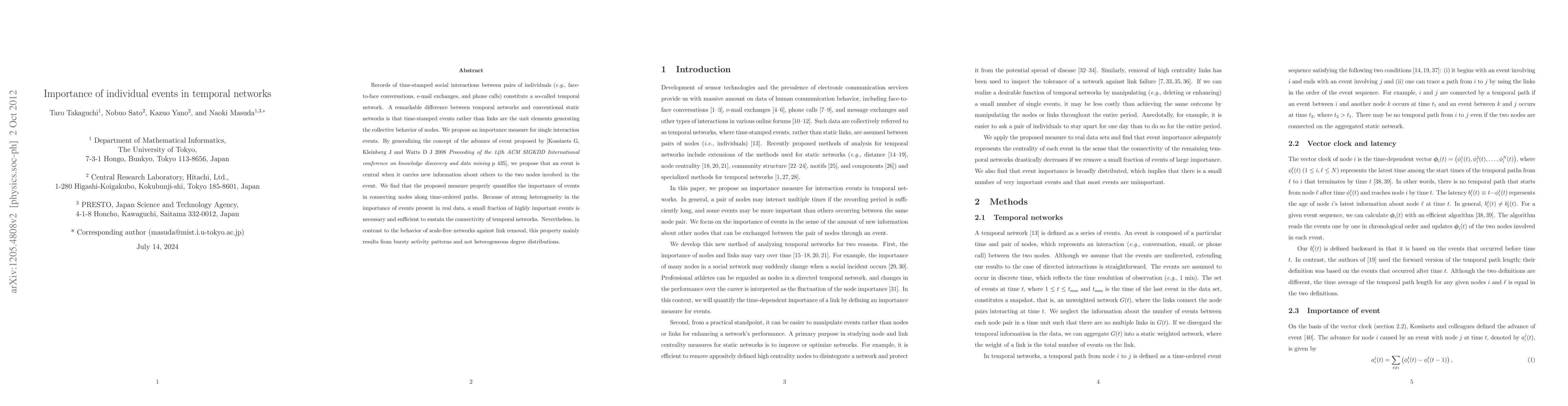 Records of time-stamped social interactions between pairs of individuals (e.g., face-to-face conversations, e-mail exchanges, and phone calls) constitute a so-called temporal network. A remarkable difference between temporal networks and conventional static networks is that time-stamped events rather than links are the unit elements generating the collective behavior of nodes. We propose an importance measure for single interaction events. By generalizing the concept of the advance of event proposed by [Kossinets G, Kleinberg J, and Watts D J (2008) Proceeding of the 14th ACM SIGKDD International conference on knowledge discovery and data mining, p 435], we propose that an event is central when it carries new information about others to the two nodes involved in the event. We find that the proposed measure properly quantifies the importance of events in connecting nodes along time-ordered paths. Because of strong heterogeneity in the importance of events present in real data, a small fraction of highly important events is necessary and sufficient to sustain the connectivity of temporal networks. Nevertheless, in contrast to the behavior of scale-free networks against link removal, this property mainly results from bursty activity patterns and not heterogeneous degree distributions.