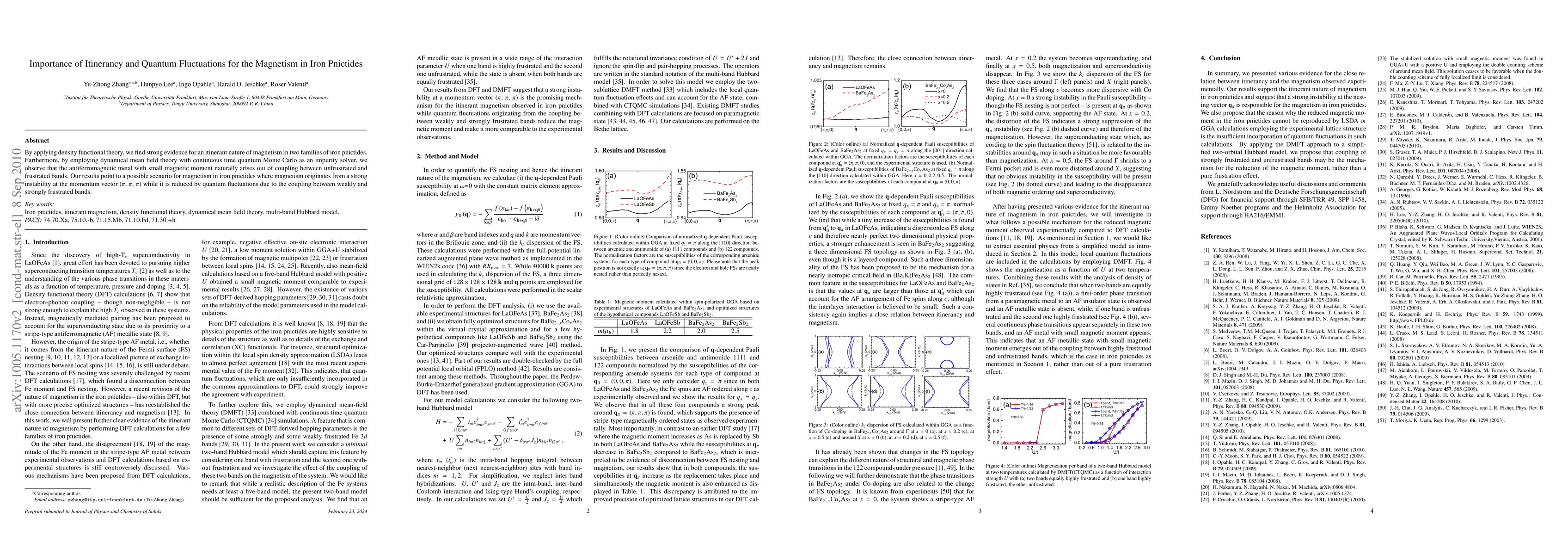 By applying density functional theory, we find strong evidence for an itinerant nature of magnetism in two families of iron pnictides. Furthermore, by employing dynamical mean field theory with continuous time quantum Monte Carlo as an impurity solver, we observe that the antiferromagnetic metal with small magnetic moment naturally arises out of coupling between unfrustrated and frustrated bands. Our results point to a possible scenario for magnetism in iron pnictides where magnetism originates from a strong instability at the momentum vector ($\pi$, $\pi$, $\pi$) while it is reduced by quantum fluctuations due to the coupling between weakly and strongly frustrated bands.