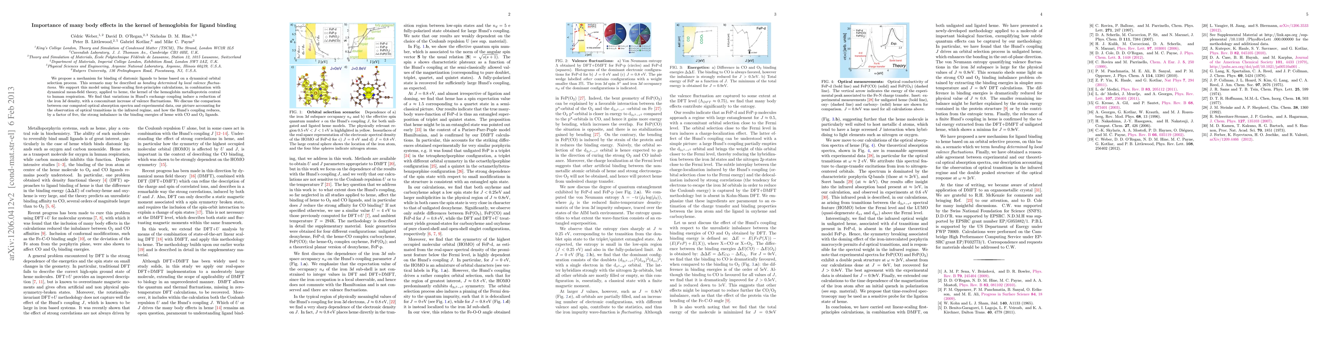 We propose a mechanism for binding of diatomic ligands to heme based on a dynamical orbital selection process. This scenario may be described as bonding determined by local valence fluctuations. We support this model using linear-scaling first-principles calculations, in combination with dynamical mean-field theory, applied to heme, the kernel of the hemoglobin metalloprotein central to human respiration. We find that variations in Hund's exchange coupling induce a reduction of the iron 3d density, with a concomitant increase of valence fluctuations. We discuss the comparison between our computed optical absorption spectra and experimental data, our picture accounting for the observation of optical transitions in the infrared regime, and how the Hund's coupling reduces, by a factor of five, the strong imbalance in the binding energies of heme with CO and O_2 ligands.
