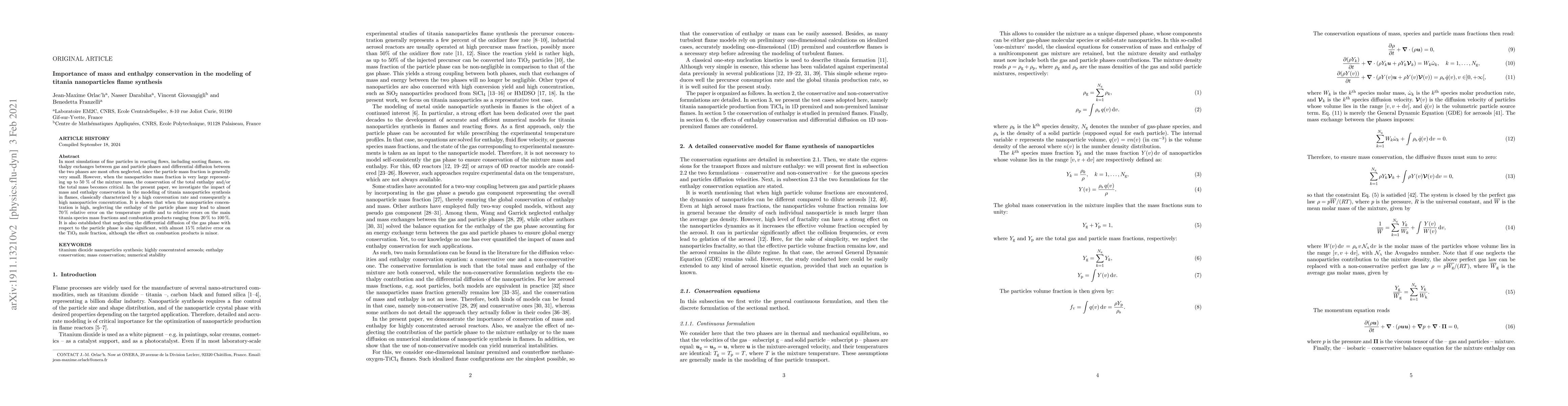In most simulations of fine particles in reacting flows, including sooting flames, enthalpy exchanges between gas and particle phases and differential diffusion between the two phases are most often neglected, since the particle mass fraction is generally very small. However, when the nanoparticles mass fraction is very large representing up to 50% of the mixture mass, the conservation of the total enthalpy and/or the total mass becomes critical. In the present paper, we investigate the impact of mass and enthalpy conservation in the modeling of titania nanoparticles synthesis in flames, classically characterized by a high conversation rate and consequently a high nanoparticles concentration. It is shown that when the nanoparticles concentration is high, neglecting the enthalpy of the particle phase may lead to almost 70% relative error on the temperature profile and to relative errors on the main titania species mass fractions and combustion products ranging from 20% to 100%. It is also established that neglecting the differential diffusion of the gas phase with respect to the particle phase is also significant, with almost 15% relative error on the TiO$_2$ mole fraction, although the effect on combustion products is minor.
