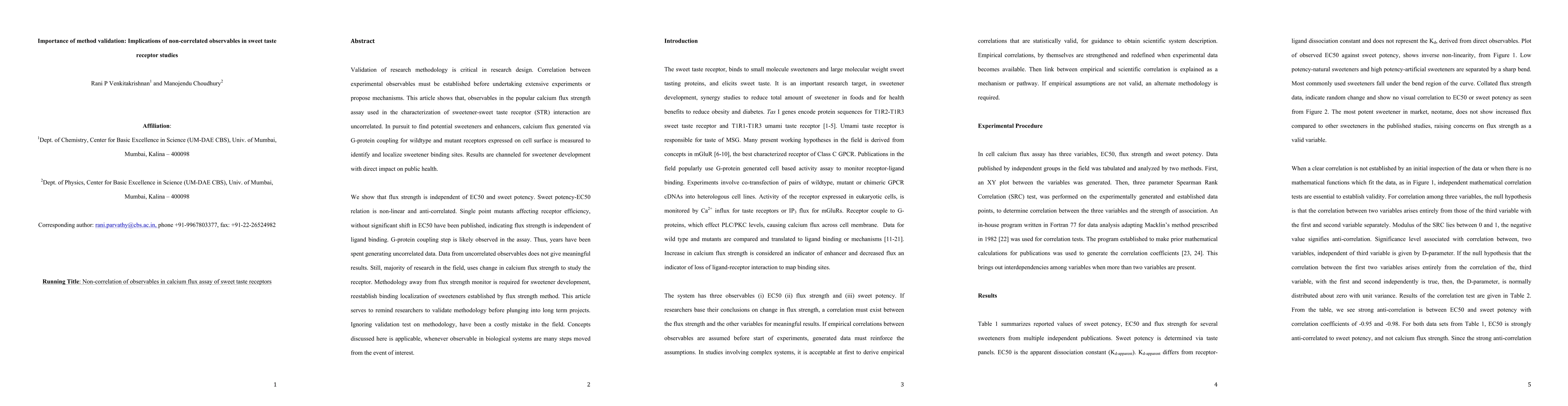 Validation of research methodology is critical in research design. Correlation between experimental observables must be established before undertaking extensive experiments or propose mechanisms. This article shows that, observables in the popular calcium flux strength assay used in the characterization of sweetener-sweet taste receptor (STR) interaction are uncorrelated. In pursuit to find potential sweeteners and enhancers, calcium flux generated via G-protein coupling for wildtype and mutant receptors expressed on cell surface is measured to identify and localize sweetener binding sites. Results are channeled for sweetener development with direct impact on public health. We show that flux strength is independent of EC50 and sweet potency. Sweet potency-EC50 relation is non-linear and anti-correlated. Single point mutants affecting receptor efficiency, without significant shift in EC50 have been published, indicating flux strength is independent of ligand binding. G-protein coupling step is likely observed in the assay. Thus, years have been spent generating uncorrelated data. Data from uncorrelated observables does not give meaningful results. Still, majority of research in the field, uses change in calcium flux strength to study the receptor. Methodology away from flux strength monitor is required for sweetener development, reestablish binding localization of sweeteners established by flux strength method. This article serves to remind researchers to validate methodology before plunging into long term projects. Ignoring validation test on methodology, have been a costly mistake in the field. Concepts discussed here is applicable, whenever observable in biological systems are many steps moved from the event of interest.