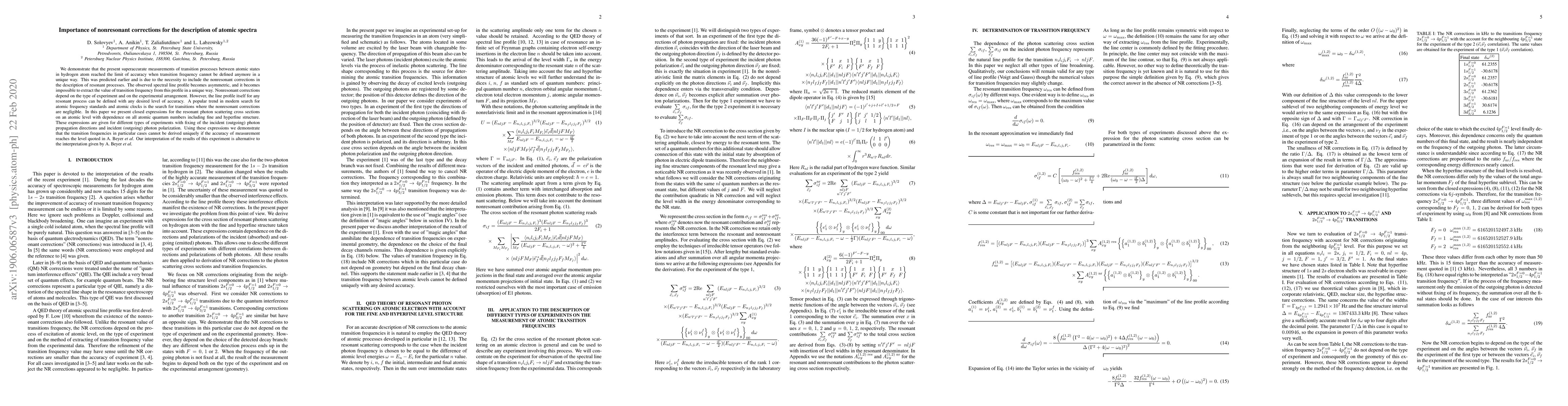 We demonstrate that the present superaccurate measurements of transition processes between atomic states in hydrogen atom reached the limit of accuracy when transition frequency cannot be defined anymore in a unique way. This was predicted earlier and is due to the necessity to include the nonresonant corrections in the description of resonant processes. The observed spectral line profile becomes asymmetric, and it becomes impossible to extract the value of transition frequency from this profile in a unique way. Nonresonant corrections depend on the type of experiment and on the experimental arrangement. However, the line profile itself for any resonant process can be defined with any desired level of accuracy. A popular trend in modern search for atomic frequency standards and atomic clocks is the search for transitions where the nonresonant corrections are negligible. In this paper we present closed expressions for the resonant photon scattering cross sections on an atomic level with dependence on all atomic quantum numbers including fine and hyperfine structure. These expressions are given for different types of experiments with fixing of the incident (outgoing) photon propagation directions and incident (outgoing) photon polarization. Using these expressions we demonstrate that the transition frequencies in particular cases cannot be derived uniquely if the accuracy of measurement reaches the level quoted in A. Beyer {\it et al}. Our interpretation of the results of this experiment is alternative to the interpretation given by A. Beyer {\it et al}.
