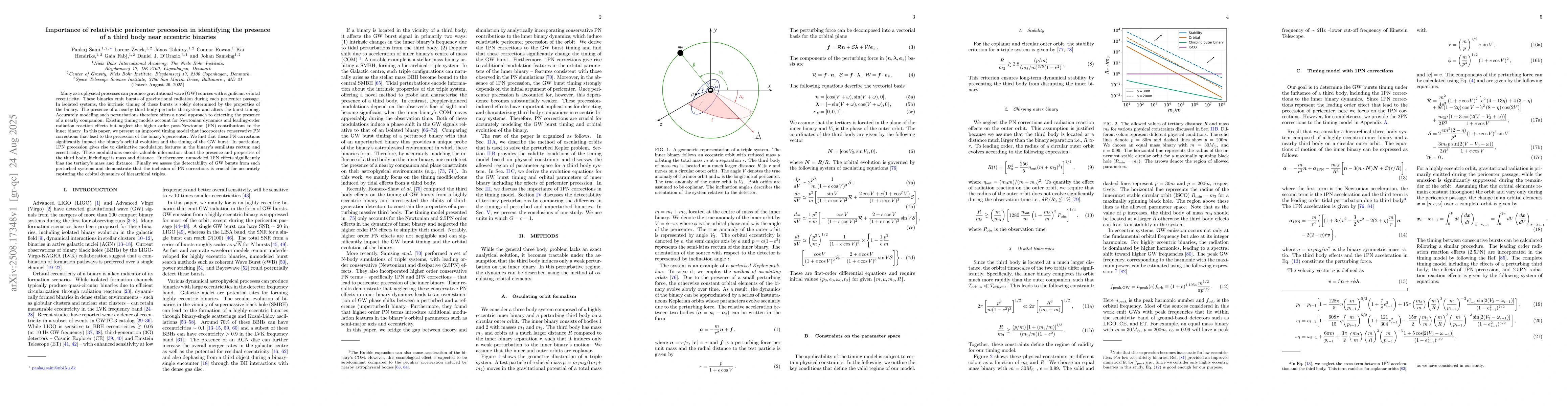 Many astrophysical processes can produce gravitational wave (GW) sources with significant orbital eccentricity. These binaries emit bursts of gravitational radiation during each pericenter passage. In isolated systems, the intrinsic timing of these bursts is solely determined by the properties of the binary. The presence of a nearby third body perturbs the system and alters the burst timing. Accurately modeling such perturbations therefore offers a novel approach to detecting the presence of a nearby companion. Existing timing models account for Newtonian dynamics and leading-order radiation reaction effects but neglect the higher order post-Newtonian (PN) contributions to the inner binary. In this paper, we present an improved timing model that incorporates conservative PN corrections that lead to the precession of the binary's pericenter. We find that these PN corrections significantly impact the binary's orbital evolution and the timing of the GW burst. In particular, 1PN precession gives rise to distinctive modulation features in the binary's semilatus rectum and eccentricity. These modulations encode valuable information about the presence and properties of the third body, including its mass and distance. Furthermore, unmodeled 1PN effects significantly bias the tertiary's mass and distance. Finally we assess the detectability of GW bursts from such perturbed systems and demonstrate that the inclusion of PN corrections is crucial for accurately capturing the orbital dynamics of hierarchical triples.