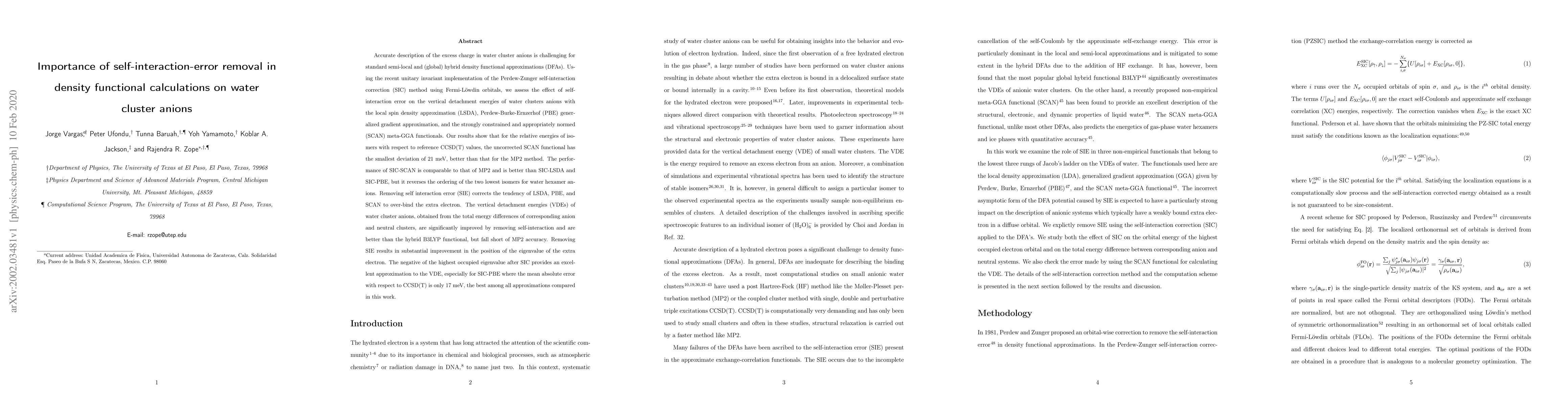 This paper assesses the impact of self-interaction error (SIE) correction on density functional calculations for water cluster anions, showing that SIE removal significantly improves vertical detachment energies and the relative energies of isomers, with SIC-SCAN performing comparably to MP2 and outperforming other methods. The negative of the highest occupied eigenvalue post-SIE correlates closely with VDEs, especially for SIC-PBE.