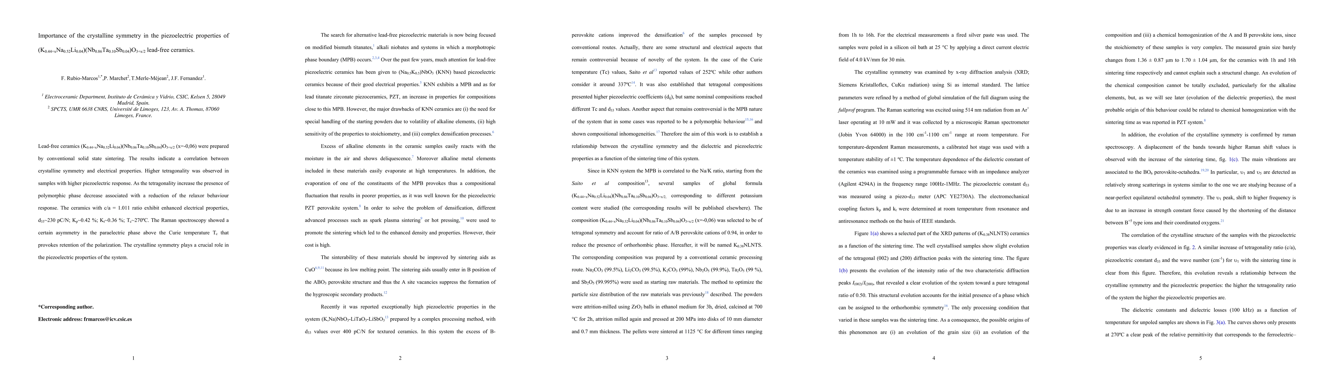 Lead-free ceramics (K0.44+xNa0.52Li0.04)(Nb0.86Ta0.10Sb0.04)O3+x/2 (x=-0,06) were prepared by conventional solid state sintering. The results indicate a correlation between crystalline symmetry and electrical properties. Higher tetragonality was observed in samples with higher piezoelectric response. As the tetragonality increase the presence of polymorphic phase decrease associated with a reduction of the relaxor behaviour response. The ceramics with c/a = 1.011 ratio exhibit enhanced electrical properties. The Raman spectroscopy showed a certain asymmetry in the paraelectric phase above the Curie temperature Tc that provokes retention of the polarization. The crystalline symmetry plays a crucial role in the piezoelectric properties of the system.