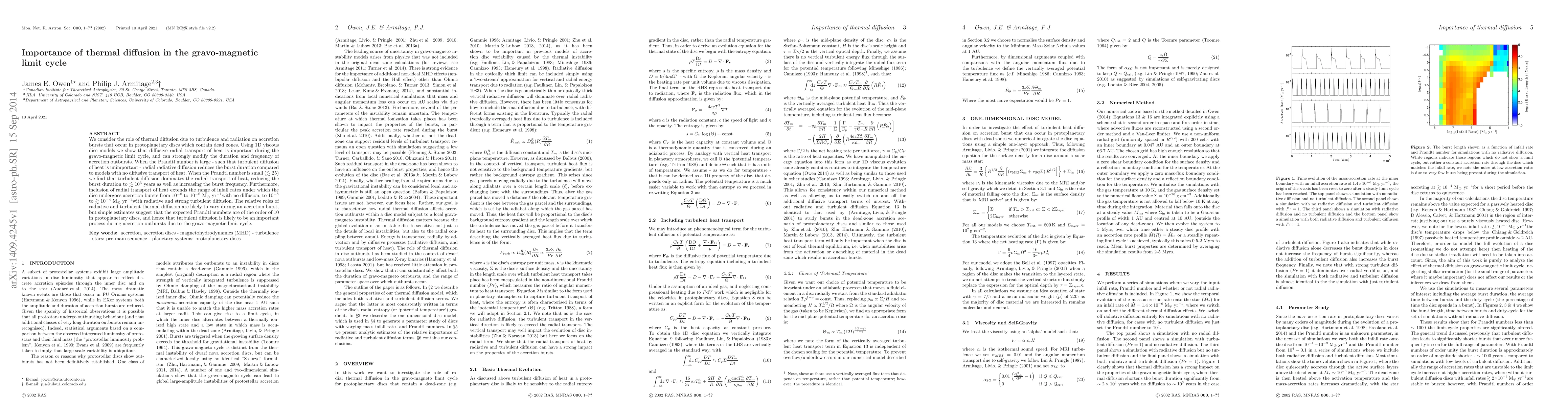 We consider the role of thermal diffusion due to turbulence and radiation on accretion bursts that occur in protoplanetary discs which contain dead zones. Using 1D viscous disc models we show that diffusive radial transport of heat is important during the gravo-magnetic limit cycle, and can strongly modify the duration and frequency of accretion outbursts. When the Prandtl number is large - such that turbulent diffusion of heat is unimportant - radial radiative diffusion reduces the burst duration compared to models with no diffusive transport of heat. When the Prandtl number is small ($\lesssim 25$) we find that turbulent diffusion dominates the radial transport of heat, reducing the burst duration to $\lesssim 10^3$ years as well as increasing the burst frequency. Furthermore, inclusion of radial transport of heat extends the range of infall rates under which the disc undergoes accretion bursts from $10^{-8}$ to $10^{-6}$ M$_\odot$ yr$^{-1}$ with no diffusion, to $10^{-8}$ to $\gtrsim10^{-4}$ M$_\odot$ yr$^{-1}$ with radiative and strong turbulent diffusion. The relative roles of radiative and turbulent thermal diffusion are likely to vary during an accretion burst, but simple estimates suggest that the expected Prandtl numbers are of the order of 10 in protoplanetary discs, and hence that turbulent diffusion is likely to be an important process during accretion outbursts due to the gravo-magnetic limit cycle.