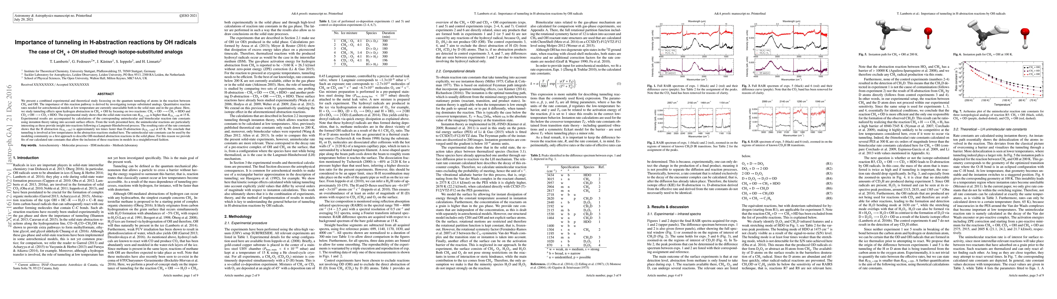 We present a combined experimental and theoretical study focussing on the quantum tunneling of atoms in the reaction between CH4 and OH. The importance of this reaction pathway is derived by investigating isotope substituted analogs. Quantitative reaction rates needed for astrochemical models at low temperature are currently unavailable both in the solid state and in the gas phase. Here, we study tunneling effects upon hydrogen abstraction in CH4 + OH by focusing on two reactions: CH4 + OD -> CH3 + HDO and CD4 + OH -> CD3 + HDO. The experimental study shows that the solid-state reaction rate R(CH4 + OD) is higher than R(CD4 + OH) at 15 K. Experimental results are accompanied by calculations of the corresponding unimolecular and bimolecular reaction rate constants using instanton theory taking into account surface effects. From the work presented here, the unimolecular reactions are particularly interesting as these provide insight into reactions following a Langmuir-Hinshelwood process. The resulting ratio of the rate constants shows that the H abstraction (k(CH4 + OD)) is approximately ten times faster than D-abstraction (k(CD4 + OH)) at 65 K. We conclude that tunneling is involved at low temperatures in the abstraction reactions studied here. The unimolecular rate constants can be used by the modeling community as a first approach to describe OH-mediated abstraction reactions in the solid phase. For this reason we provide fits of our calculated rate constants that allow the inclusion of these reactions in models in a straightforward fashion.