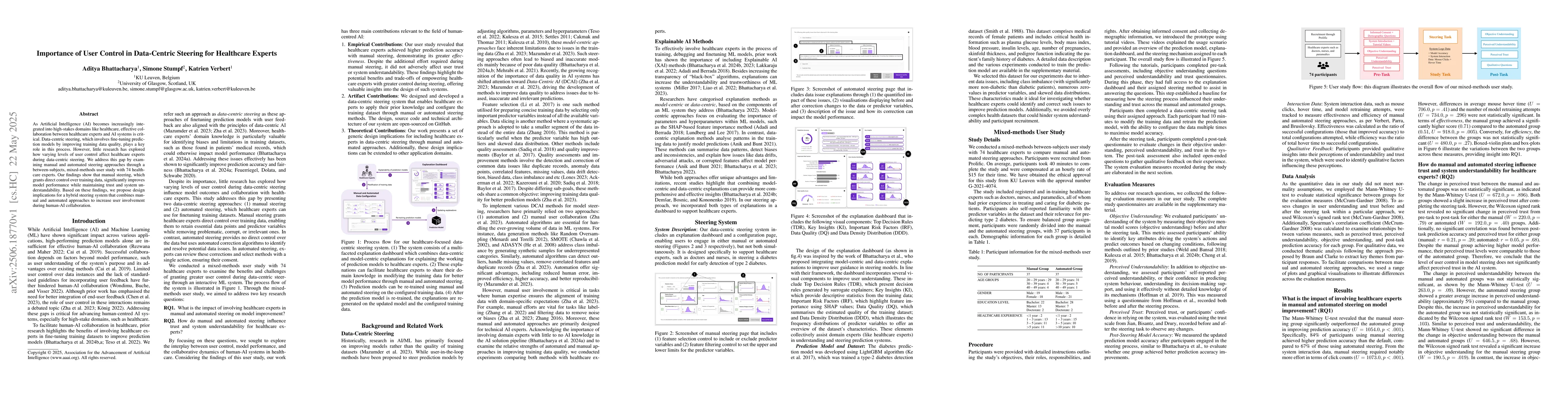 As Artificial Intelligence (AI) becomes increasingly integrated into high-stakes domains like healthcare, effective collaboration between healthcare experts and AI systems is critical. Data-centric steering, which involves fine-tuning prediction models by improving training data quality, plays a key role in this process. However, little research has explored how varying levels of user control affect healthcare experts during data-centric steering. We address this gap by examining manual and automated steering approaches through a between-subjects, mixed-methods user study with 74 healthcare experts. Our findings show that manual steering, which grants direct control over training data, significantly improves model performance while maintaining trust and system understandability. Based on these findings, we propose design implications for a hybrid steering system that combines manual and automated approaches to increase user involvement during human-AI collaboration.