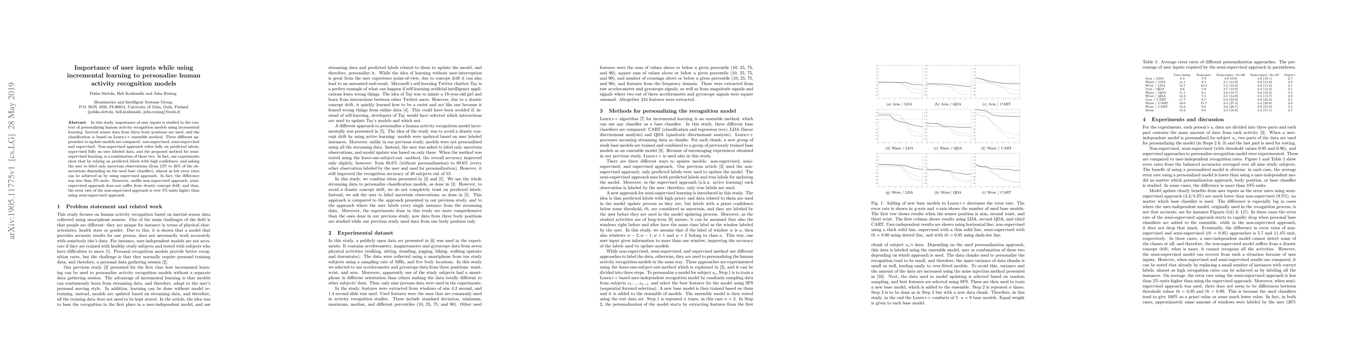 In this study, importance of user inputs is studied in the context of personalizing human activity recognition models using incremental learning. Inertial sensor data from three body positions are used, and the classification is based on Learn++ ensemble method. Three different approaches to update models are compared: non-supervised, semi-supervised and supervised. Non-supervised approach relies fully on predicted labels, supervised fully on user labeled data, and the proposed method for semi-supervised learning, is a combination of these two. In fact, our experiments show that by relying on predicted labels with high confidence, and asking the user to label only uncertain observations (from 12% to 26% of the observations depending on the used base classifier), almost as low error rates can be achieved as by using supervised approach. In fact, the difference was less than 2%-units. Moreover, unlike non-supervised approach, semi-supervised approach does not suffer from drastic concept drift, and thus, the error rate of the non-supervised approach is over 5%-units higher than using semi-supervised approach.