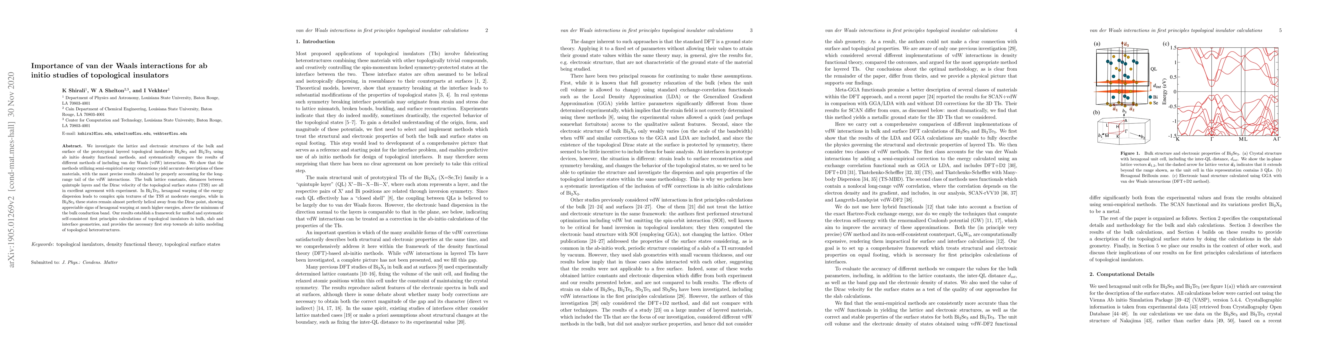 This paper investigates the lattice and electronic structures of Bi$_2$Se$_3$ and Bi$_2$Te$_3$ topological insulators using ab initio methods, emphasizing the importance of van der Waals interactions for accurate descriptions. It finds that semi-empirical energy corrections yield precise results, especially when accounting for the long-range vdW interactions.