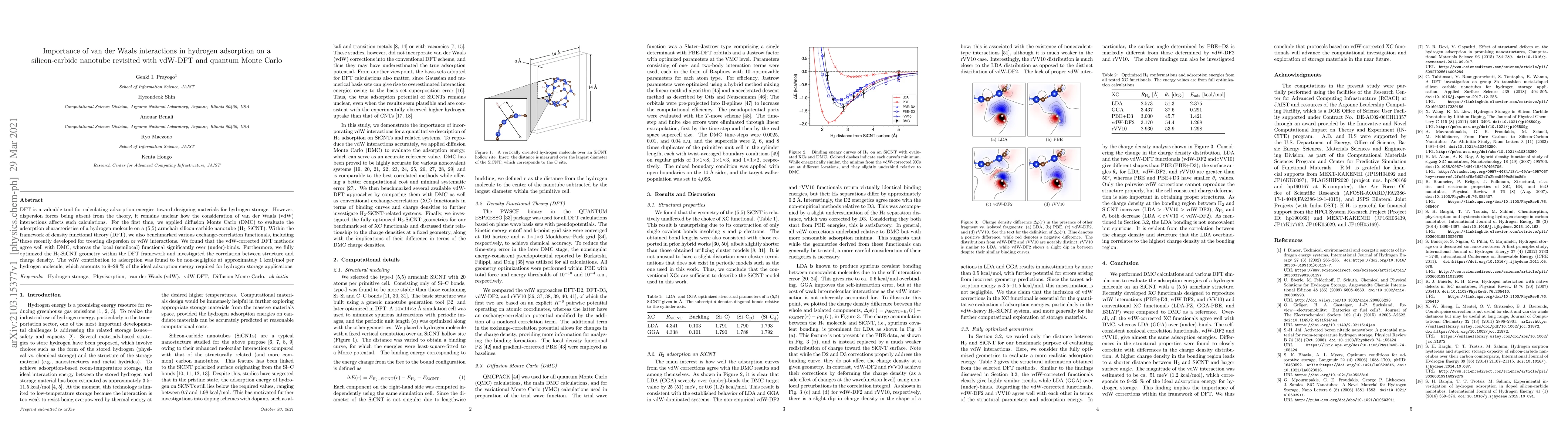 This study revisits the role of van der Waals interactions in hydrogen adsorption on a silicon-carbide nanotube using vdW-DFT and quantum Monte Carlo methods, finding that vdW-corrected DFT methods align well with DMC results, while local functionals show significant discrepancies. The vdW contribution is found to be approximately 1 kcal/mol per hydrogen molecule, representing 9-29% of the ideal adsorption energy for hydrogen storage.