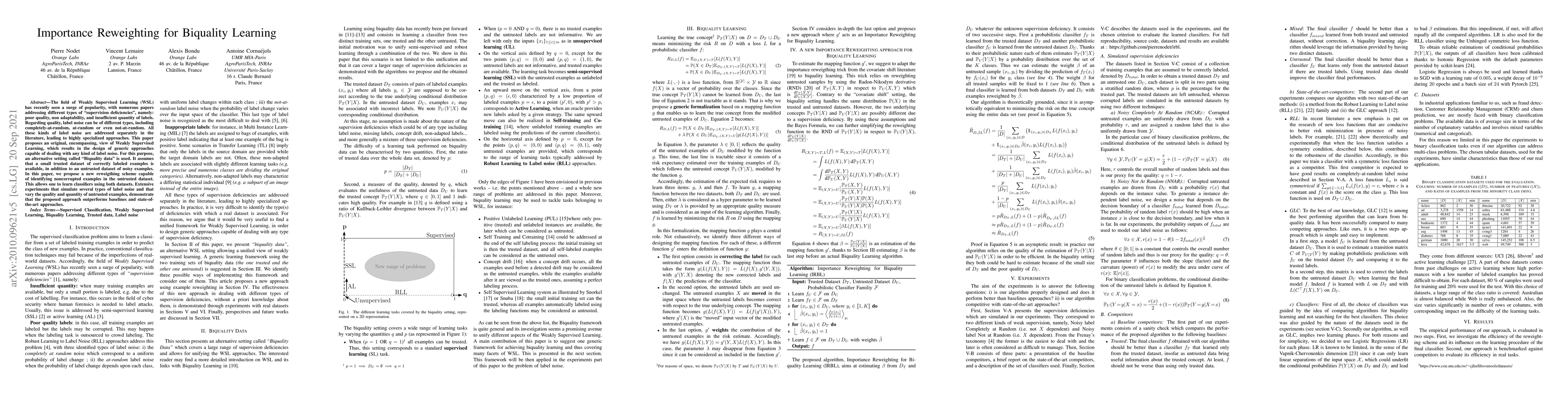 The field of Weakly Supervised Learning (WSL) has recently seen a surge of popularity, with numerous papers addressing different types of "supervision deficiencies", namely: poor quality, non adaptability, and insufficient quantity of labels. Regarding quality, label noise can be of different types, including completely-at-random, at-random or even not-at-random. All these kinds of label noise are addressed separately in the literature, leading to highly specialized approaches. This paper proposes an original, encompassing, view of Weakly Supervised Learning, which results in the design of generic approaches capable of dealing with any kind of label noise. For this purpose, an alternative setting called "Biquality data" is used. It assumes that a small trusted dataset of correctly labeled examples is available, in addition to an untrusted dataset of noisy examples. In this paper, we propose a new reweigthing scheme capable of identifying noncorrupted examples in the untrusted dataset. This allows one to learn classifiers using both datasets. Extensive experiments that simulate several types of label noise and that vary the quality and quantity of untrusted examples, demonstrate that the proposed approach outperforms baselines and state-of-the-art approaches.