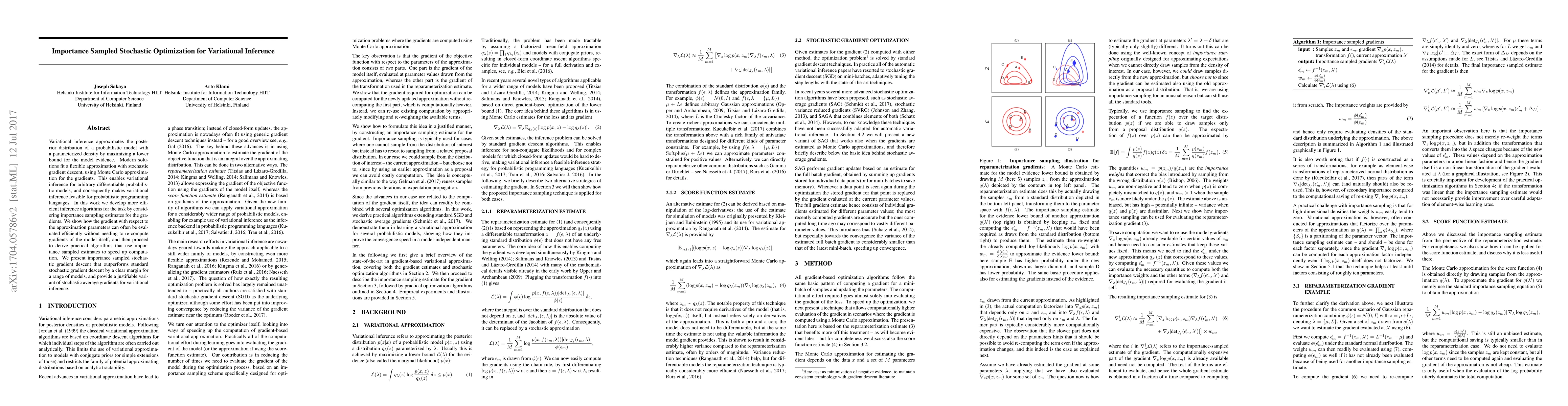 This paper introduces importance sampled stochastic optimization techniques for variational inference, showing that using importance sampling estimates can efficiently compute gradients without recalculating model gradients, leading to improved performance over standard stochastic gradient descent and stochastic average gradients.