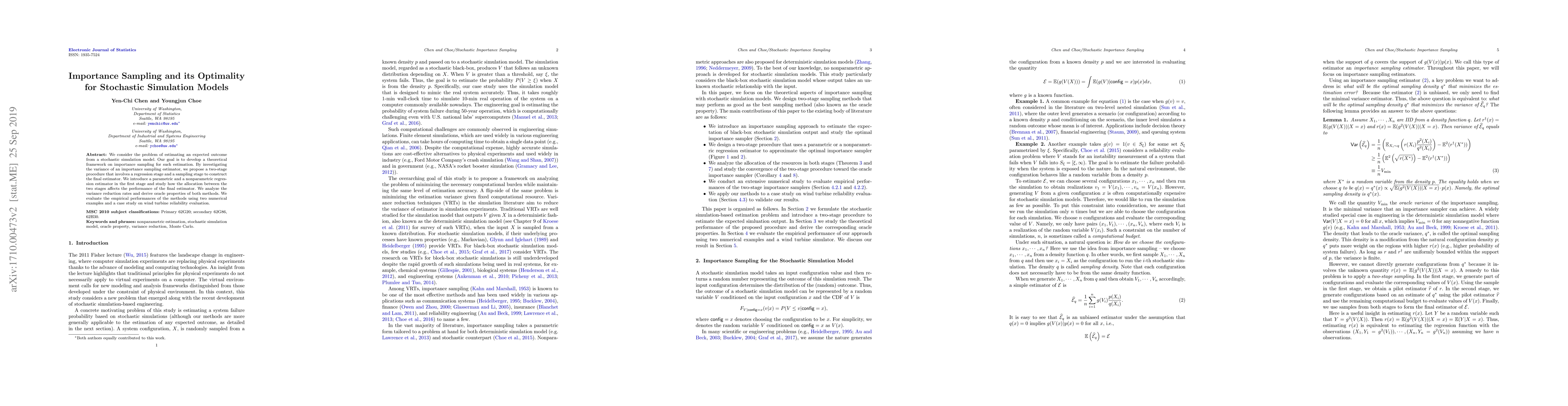 We consider the problem of estimating an expected outcome from a stochastic simulation model. Our goal is to develop a theoretical framework on importance sampling for such estimation. By investigating the variance of an importance sampling estimator, we propose a two-stage procedure that involves a regression stage and a sampling stage to construct the final estimator. We introduce a parametric and a nonparametric regression estimator in the first stage and study how the allocation between the two stages affects the performance of the final estimator. We analyze the variance reduction rates and derive oracle properties of both methods. We evaluate the empirical performances of the methods using two numerical examples and a case study on wind turbine reliability evaluation.