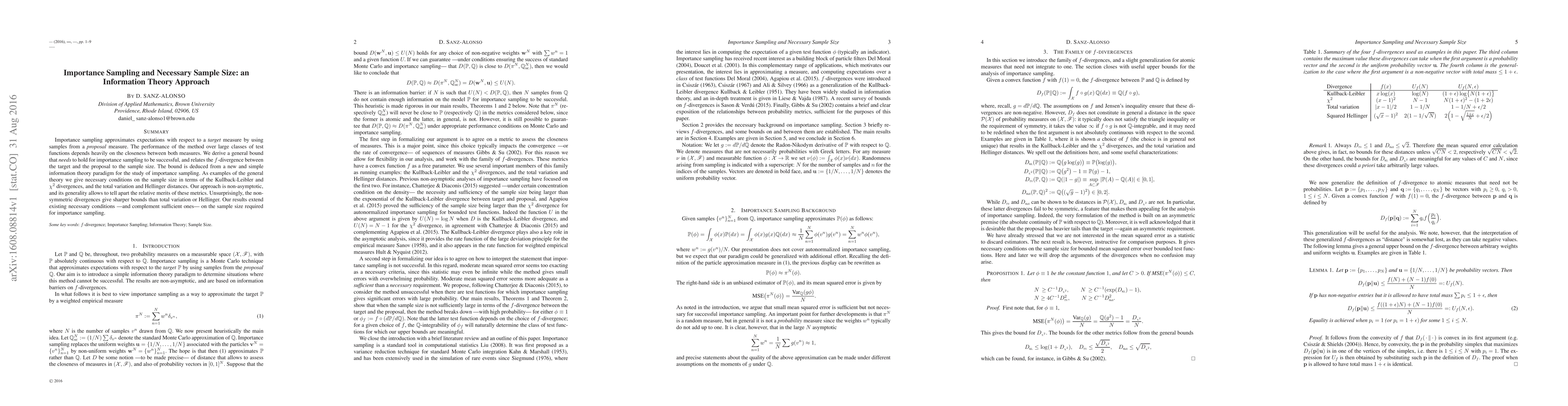 Importance sampling approximates expectations with respect to a target measure by using samples from a proposal measure. The performance of the method over large classes of test functions depends heavily on the closeness between both measures. We derive a general bound that needs to hold for importance sampling to be successful, and relates the $f$-divergence between the target and the proposal to the sample size. The bound is deduced from a new and simple information theory paradigm for the study of importance sampling. As examples of the general theory we give necessary conditions on the sample size in terms of the Kullback-Leibler and $\chi^2$ divergences, and the total variation and Hellinger distances. Our approach is non-asymptotic, and its generality allows to tell apart the relative merits of these metrics. Unsurprisingly, the non-symmetric divergences give sharper bounds than total variation or Hellinger. Our results extend existing necessary conditions -and complement sufficient ones- on the sample size required for importance sampling.